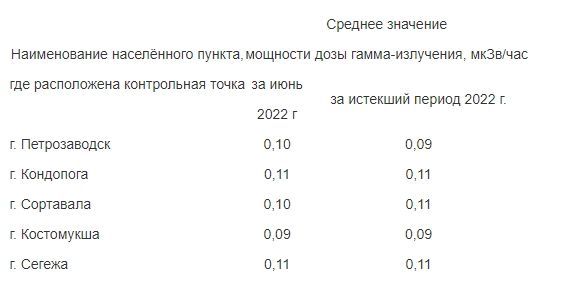 Самое высокое значение гамма-фона зафиксировано в Кондопоге — 0,12 мкЗв/ч, в Сегеже оно чуть ниже — 0,11 мкЗв/ч, в Сортавале — 0,10 мкЗв/ч.