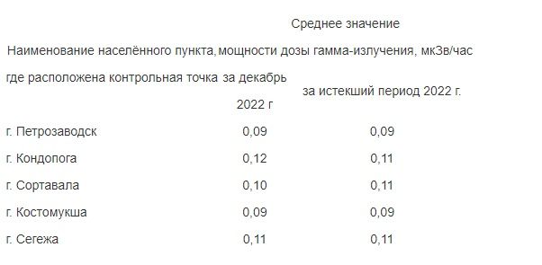 В Петрозаводске в декабре среднее значение мощности дозы гамма-излучения составляло 0,09 мкЗв/ч, в Костомукше те же цифры. Это самый низкий показатель из всех городов, где проводили замеры.