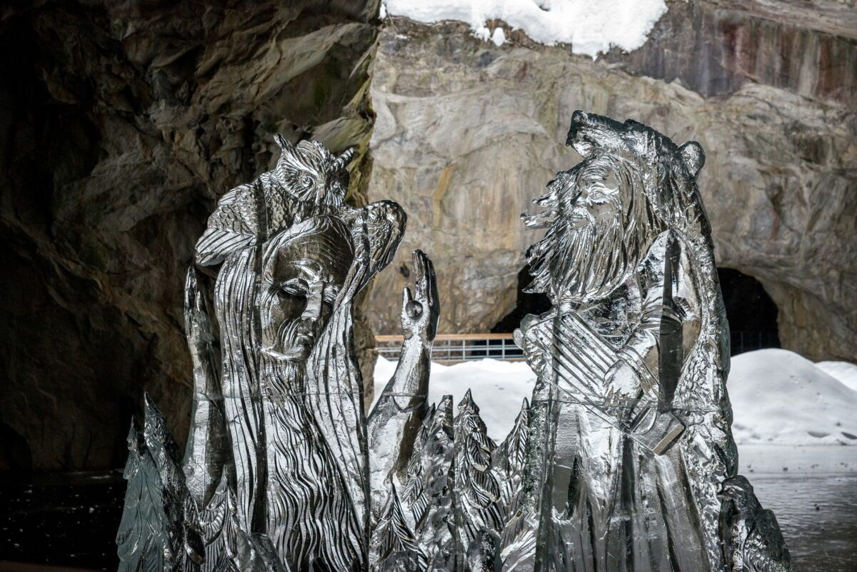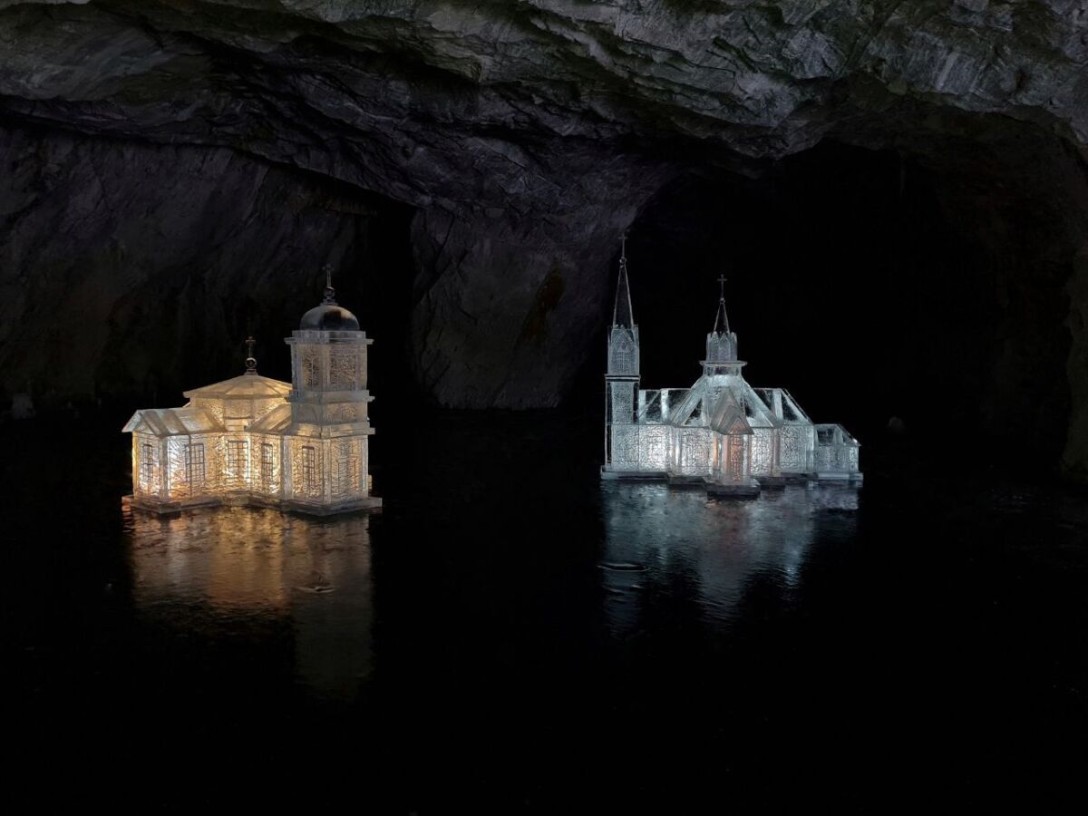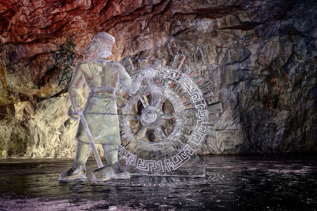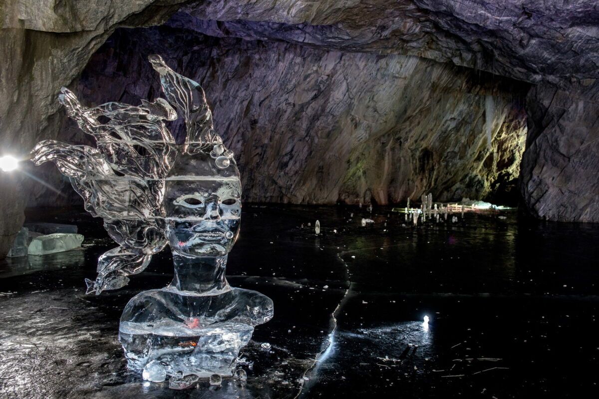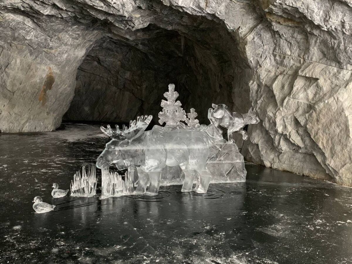 Традиция строить ледовые скульптуры в Большом колонном зале маршрута “Подземная Рускеала появилась в 2015 году, и с тех пор практически ежегодно скульпторы создают различные тематические композиции на льду подземного озера: копии архитектурных шедевров Петербурга, героев эпоса “Калевала”, представителей животного мира Карелии. В прошлом году зал подземного маршрута украшали четыре ледовые композиции в тематике «Утраченные церкви Карелии».