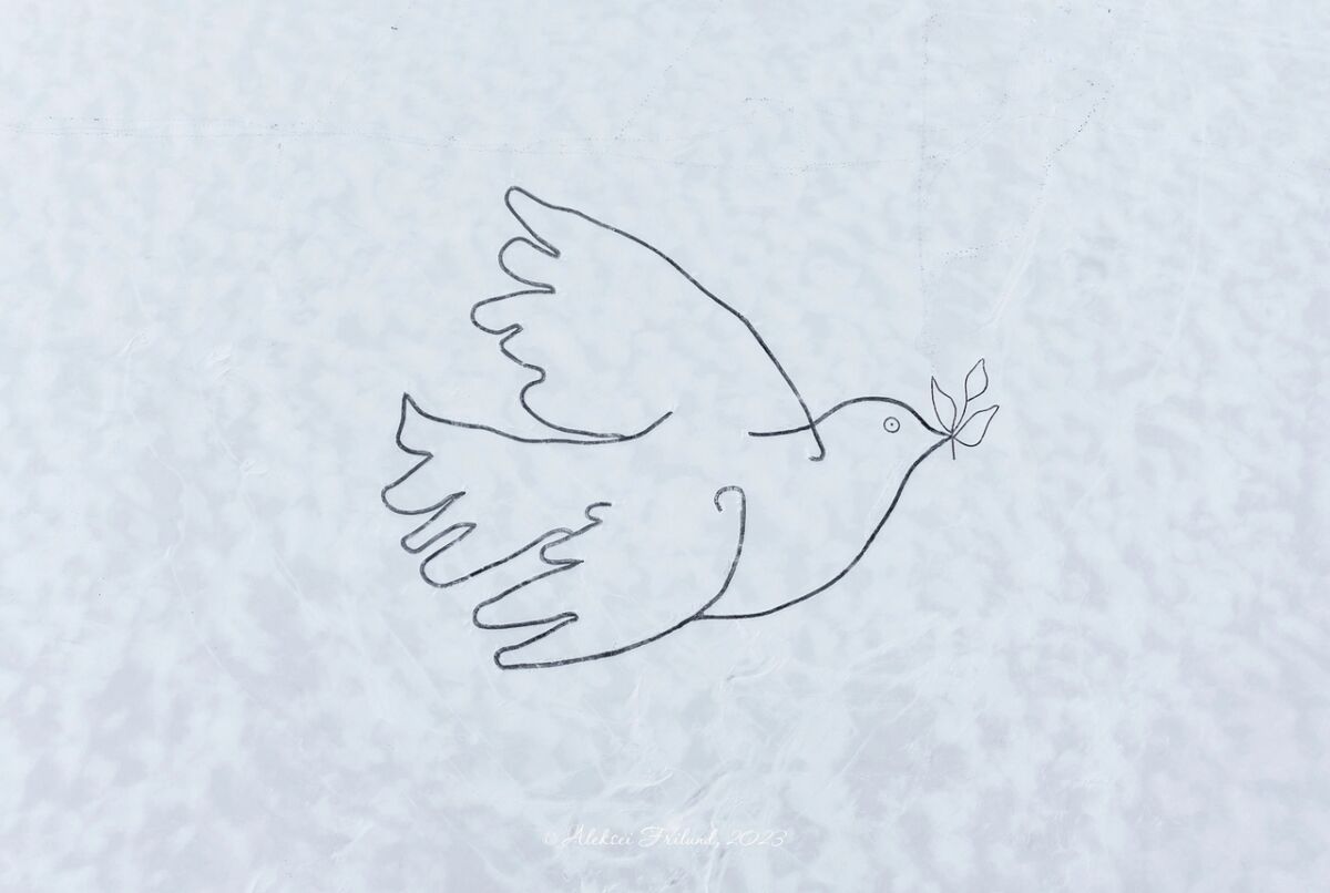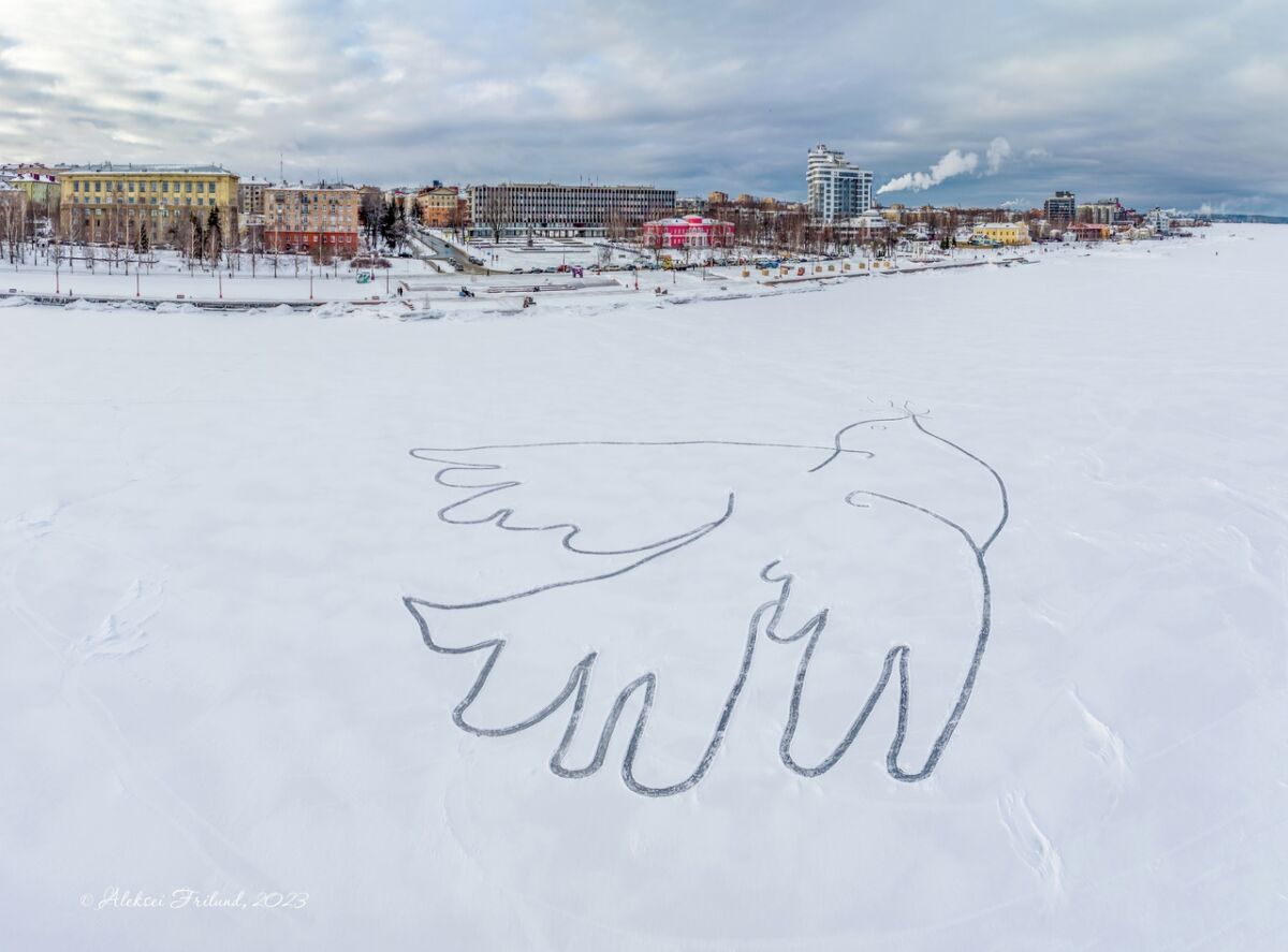 Нам, конечно, далеко до его филигранной техники, но мы решили рискнуть. Взяли лопаты и вышли на лед, так сказать, опробовать свои силы. В качестве первой пробы решено было взять самый простой и узнаваемый образ. «Голубка Пикассо» — графическое изображение белого голубя мира, впервые нарисованное Пабло Пикассо в 1949 году, — написал Алексей на своей странице в соцсети.