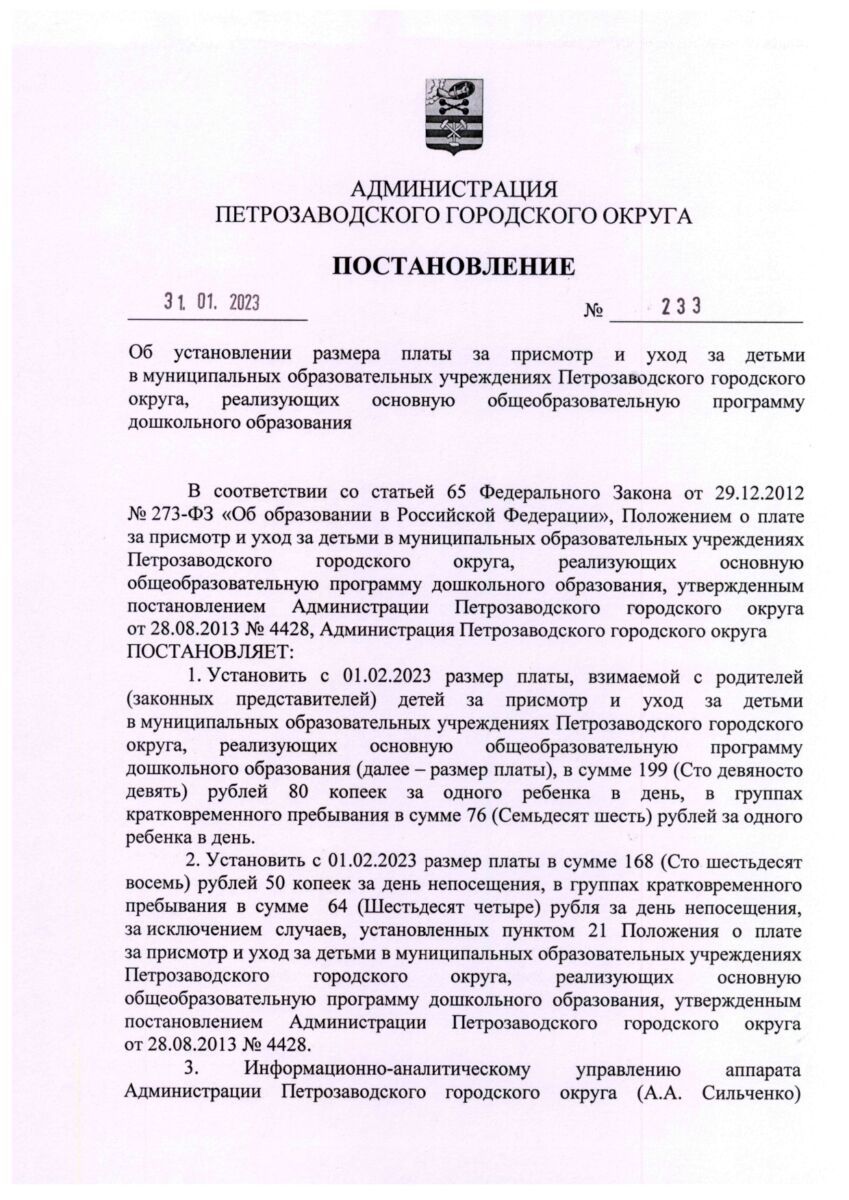 В карельской столице повысилась ежемесячная плата за детский сад. Соответствующий документ подписали в мэрии города.