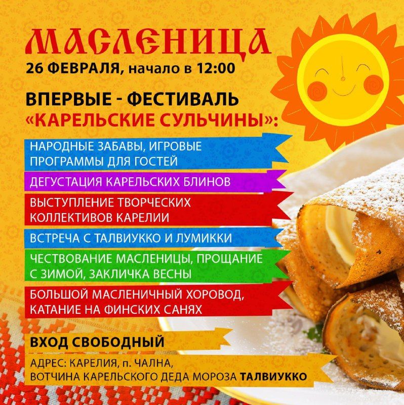 26 февраля в вотчине карельского Деда Мороза Талвиукко в поселке Чална состоится фестиваль «Карельские сульчины». Сульчины – вкусное и необычное блюдо, известное в Карелии и новгородской земле издревле. По сути это блины или плоские пироги из ржаной муки с начинкой, закрученные в рулет, выпекаемые на сковороде в печи. При этом начинка может быть самой разной, например, пшено, манка, рис.