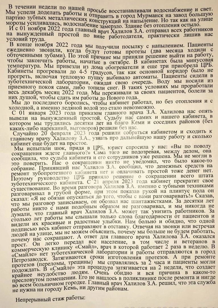 Однако с января зубных техников окончательно отправили в простой. В феврале все сотрудники кабинета неожиданно узнали, что они попали под сокращение. В письме медики сообщают, что главный врач Халилов очень грубо в унизительной форме поговорил с ними.