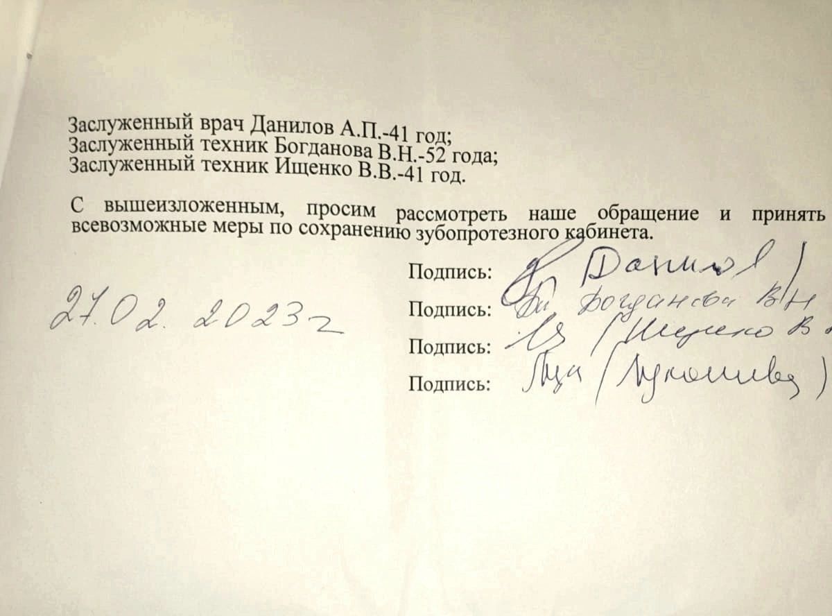 За десятки лет работы никто с нами подобным образом не разговаривал, — делятся авторы письма. – За столько лет работы мы слышали только слова благодарности от пациентов и видели их красивые и радостные улыбки. Нам больно и обидно, что одной подписью весь кабинет отправляют в отставку.