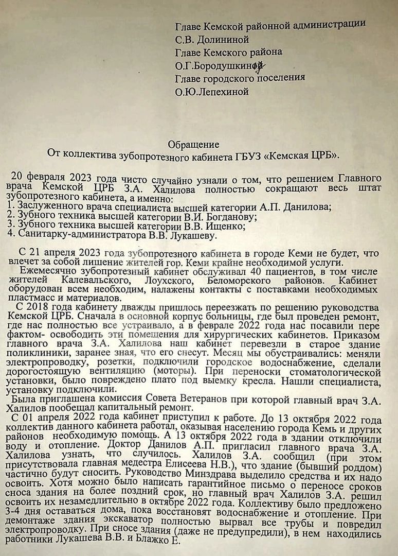 Опытные медики, которые работали в нем, – заслуженные врач и два техника, а также санитарка – написали письмо руководству района, города и Кемской больнице. Письмо опубликовано в паблике «Подслушано. Кемь». В нем работники рассказали о своих скитаниях и проблемах. С их слов, с 2018 года кабинету дважды пришлось переезжать по решению руководства Кемской ЦРБ. Сначала в основной корпус больницы, где был проведен ремонт. В феврале 2022 года протезистов поставили перед фактом: освободить эти помещения для хирургических кабинетов. Кабинет перевезли в старое здание поликлиники, которое готовилось под снос. Месяц медики потратили, чтобы обустроиться в этом здании, поменять электропроводку, вентиляцию, подключить водоснабжение.