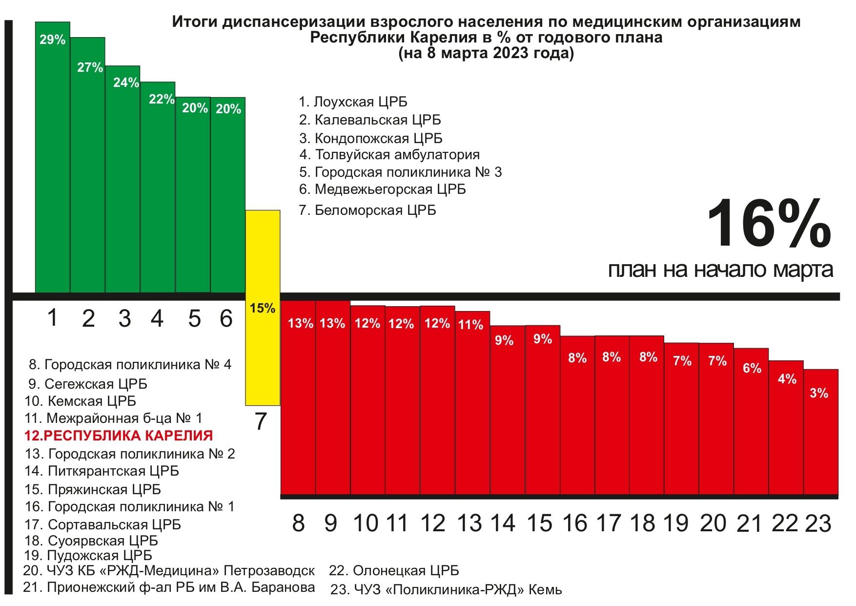 По его словам, лидерами по выполнению плана по диспансеризации стали пять районов, а именно Калевальский, Кондопожский, Лоухский, Медвежьегорский, и та часть Петрозаводска, жители которой прикреплены к городской поликлинике № 3.