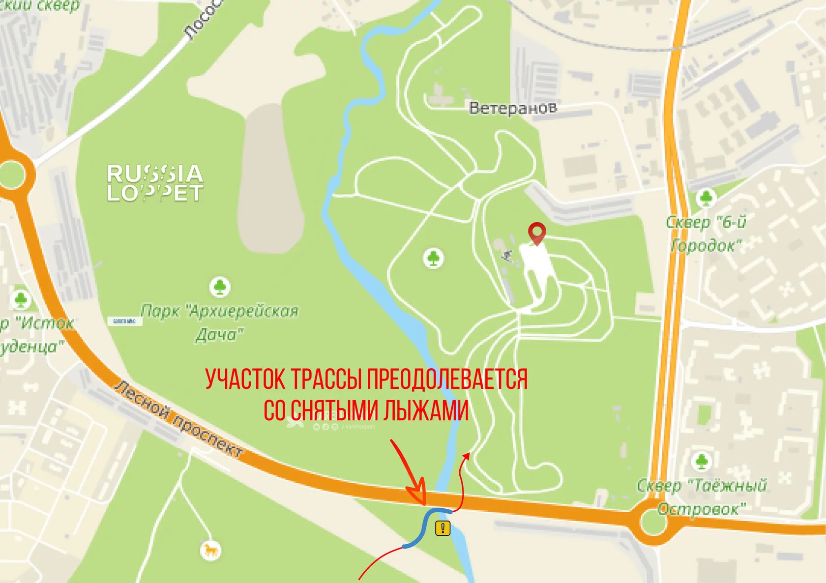 Данный участок трассы во время оттепели подвергся сильному подтоплению. На спуске появились камни и находившиеся под снегом корни, ветки. После похолодания, данный участок превратился в ледяной каток. Прохождение его на лыжах очень ОПАСНО, — предупреждают организаторы гонок.