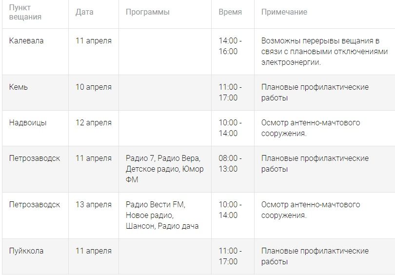 В Петрозаводске два дня будут прерываться вещание популярных радиостанций. 11 апреля с 8:00 до 13:00 из эфира уйдут радиостанции «Радио 7», «Радио Вера», «Детское радио» и «Юмор ФМ». 13 апреля с 10:00 до 14:00 нельзя будет услышать «Радио Вести ФМ», «Новое радио», «Шансон» и «Радио Дача».