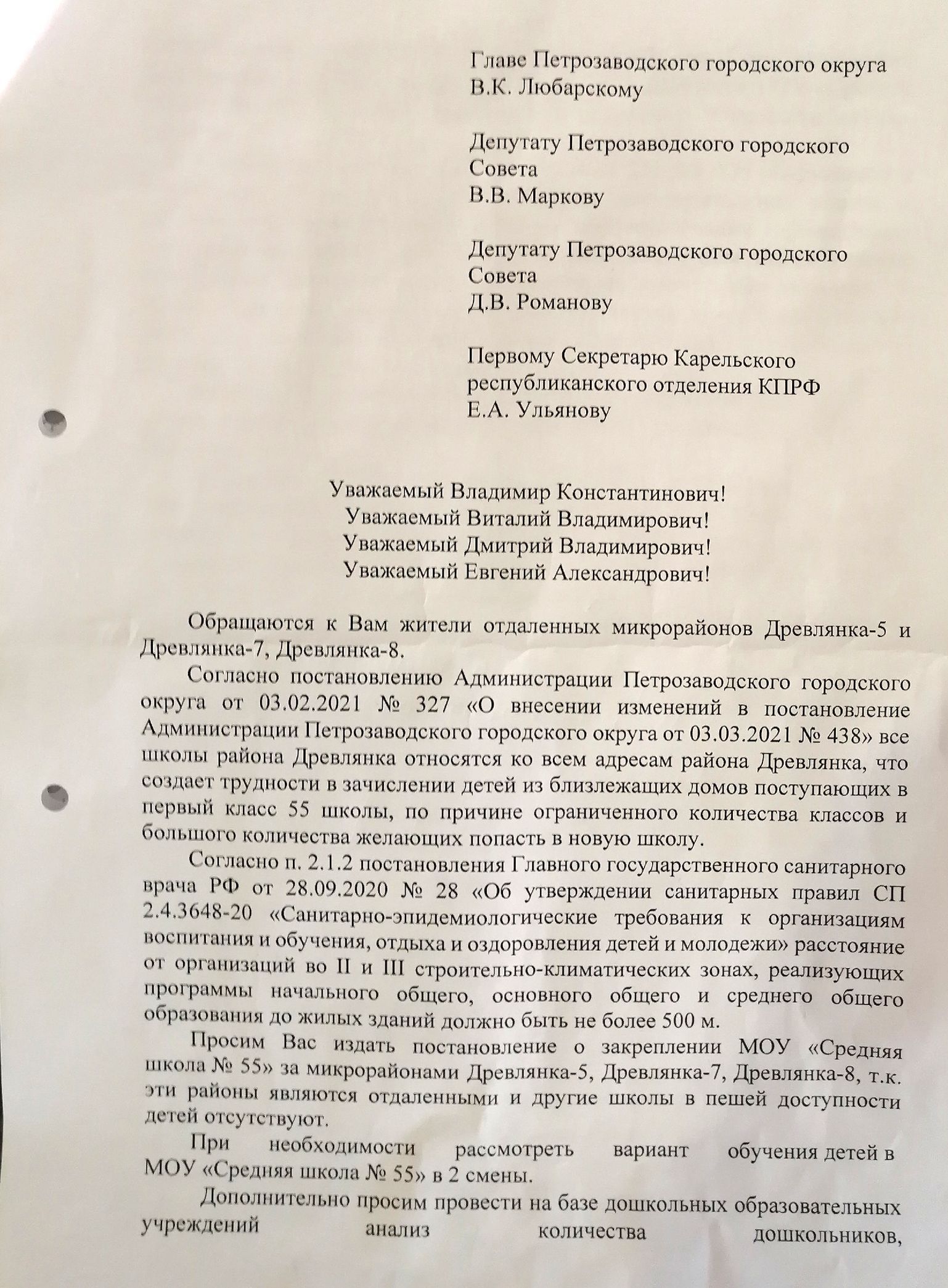 В своем обращении к главе Петрозаводска Владимиру Любарскому и древлянским депутатам, которое подписали уже более 100 человек, родители просят оставить приоритетное право именно за школьниками районов Древлянка-5,-7,-8, потому что добираться до других школ Древлянки самостоятельно и пешком их дети не смогут. Еще один вариант, который предлагают родители – рассмотреть вопрос введения второй смены. Главное – чтобы дети попали в школу, которая находится рядом. Именно так ведь и планировалось, когда в Петрозаводске возвращали закрепление учебных заведений за территориями.