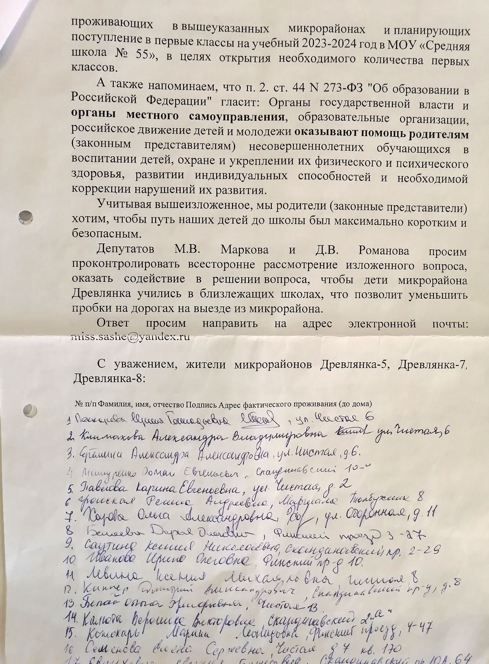 Родители проживающих в этом районе будущих школьников уверены, что проблема в том, что в ходе закрепления школ за территориями, школу №55 закрепили за всей Древлянкой, а не только новыми кварталами, где она расположена. Таким образом в новое учебное заведение могут попасть ребята со всего огромного района, тем самым вытеснить тех, кто живет рядом со школой. Понятное дело, что жителей окружающих школу домов такая перспектива пугает.