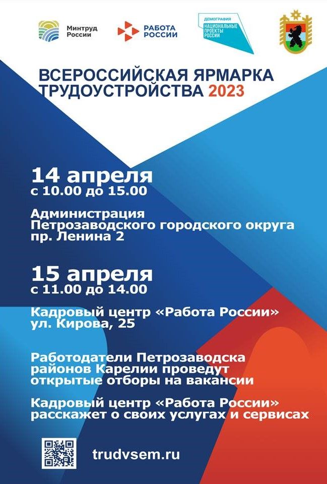Напомним, 14 апреля ярмарка будет работать с 10:00 до 15:00 в большом зале администрации города – проспект Ленина, 2. 15 апреля с 11.00 мероприятие продолжится в петрозаводском кадровом центре «Работа России» – ул. Кирова, 25. Также будут работать площадки во всех районах и городах Карелии. Подробности ЗДЕСЬ.