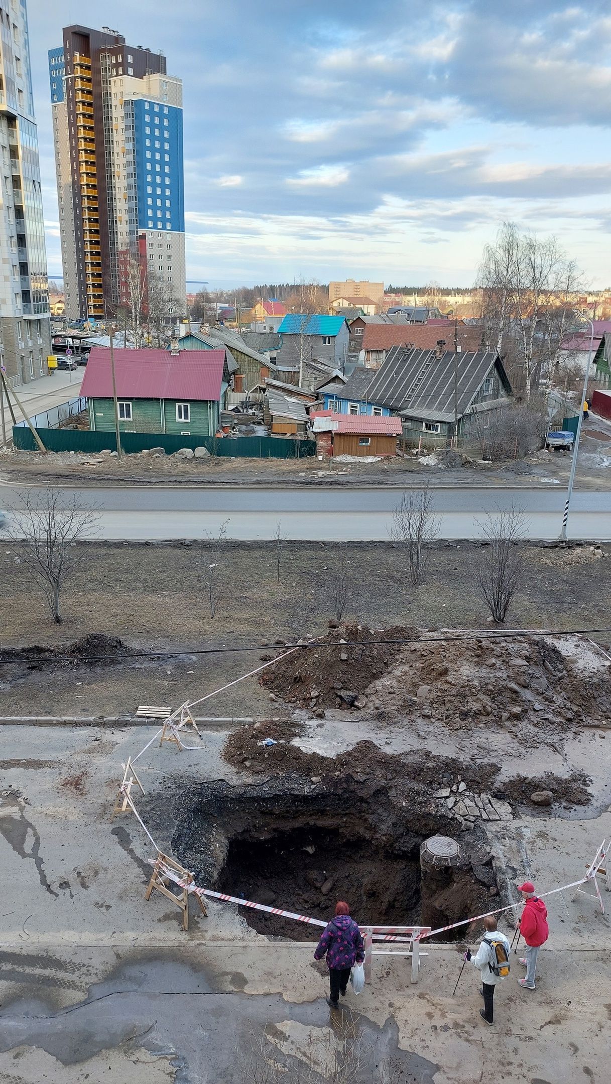 Петрозаводчанин обратил внимание на яму в асфальте на Кукковке. Впрочем, не заметить ее трудно – провал огромный. О его размере можно судить по стоящим рядом людям – диаметр дыры явно составляет несколько метров. Как будто в Петрозаводске незаметно приземлился небольшой метеорит.