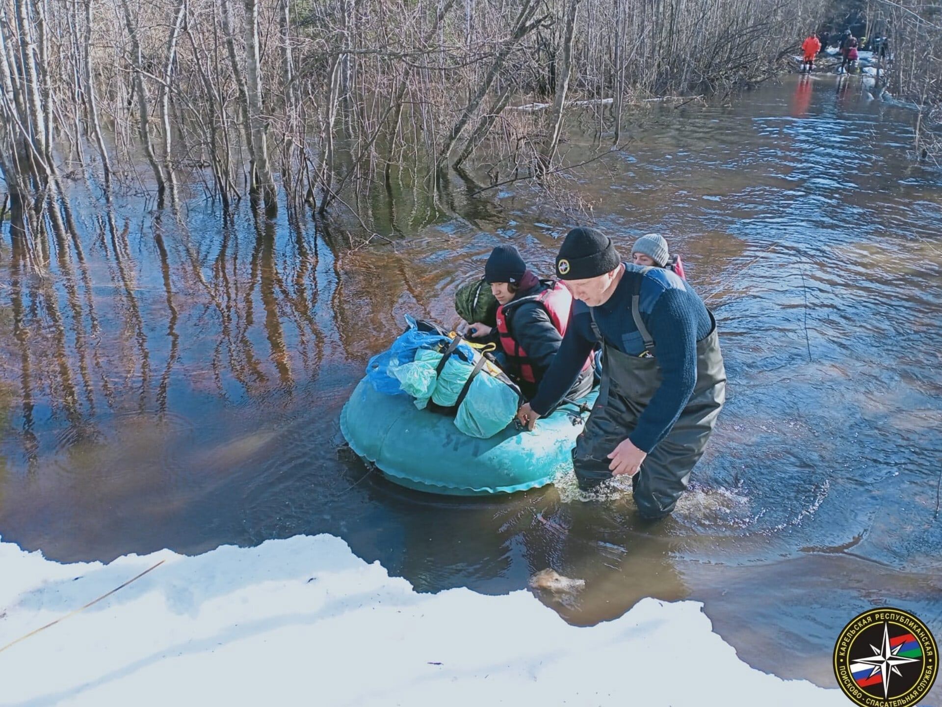 В результате обильного таяния снега, произошел разлив реки, вследствие чего, группа туристов оказалась отрезана от дороги. Расстояние между берегами реки около 60 метров.