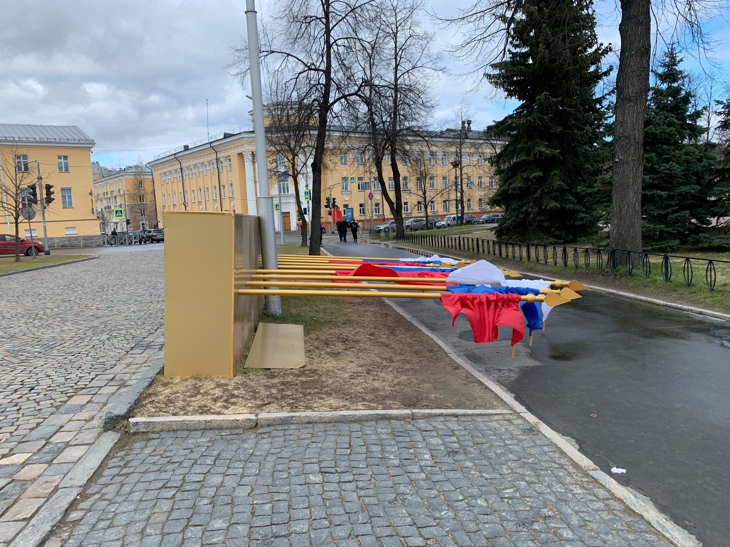 Ветер обрушил расположенную поблизости от мемориала установку с российскими флагами и конструкцию с надписью «9 Мая».