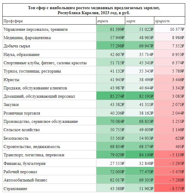 По сравнению с предыдущим месяцем сильнее всего средние предлагаемые зарплаты выросли в вакансиях для работников сферы управления персоналом – сразу на 10 377 рублей. На втором месте по приросту зарплат в Карелии оказалась сфера «Медицина, фармацевтика» (+ 8 986 рублей). На третьем месте – сфера добычи сырья, где зарплаты в вакансиях выросли на 7 352 рубля. В первую десятку вошли сфера науки и образования, спорта и красоты, туризма, юристы.