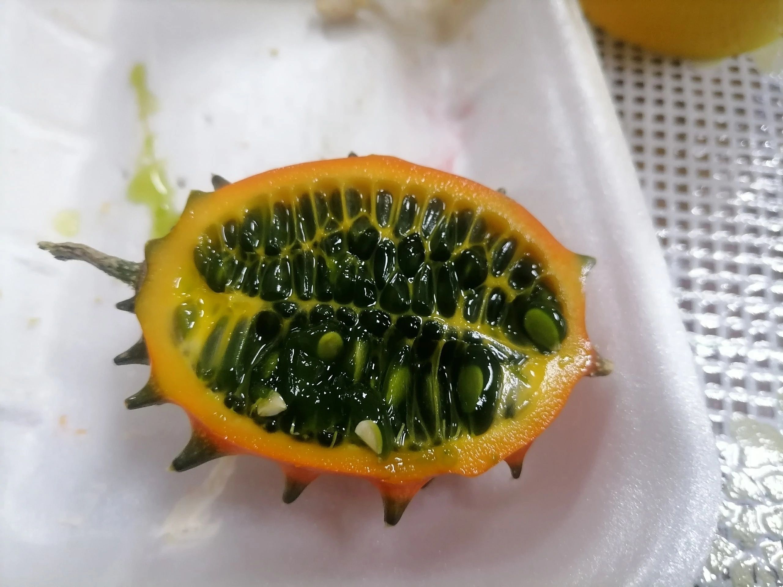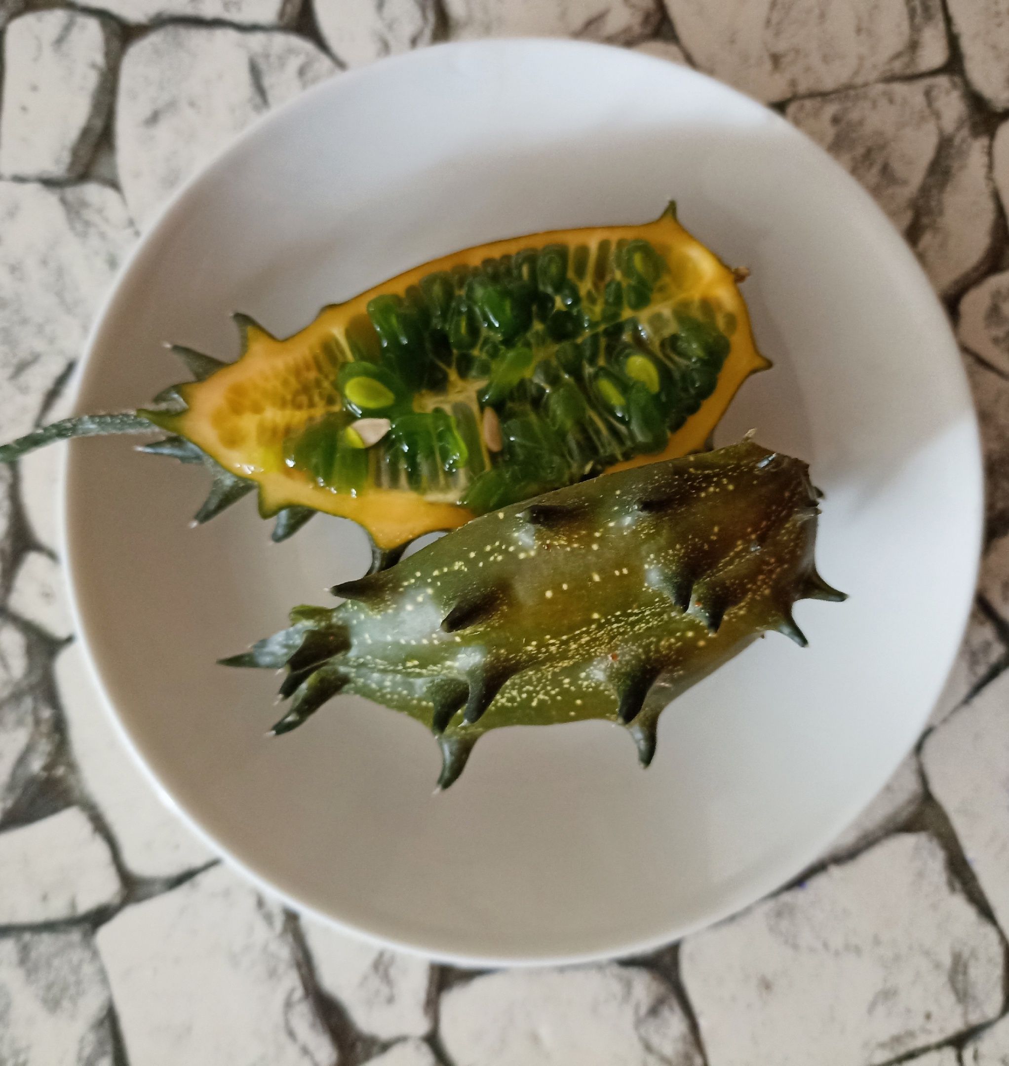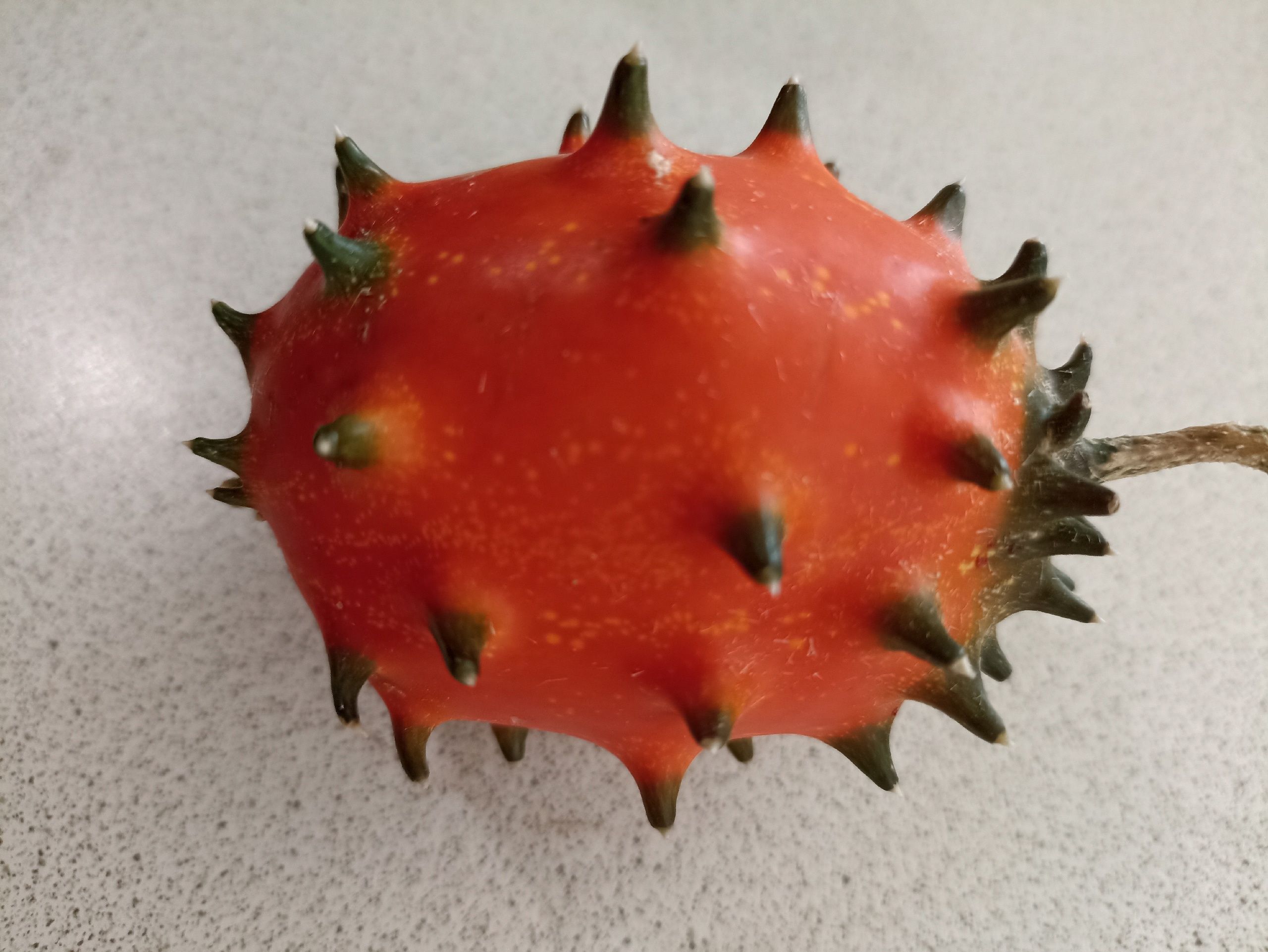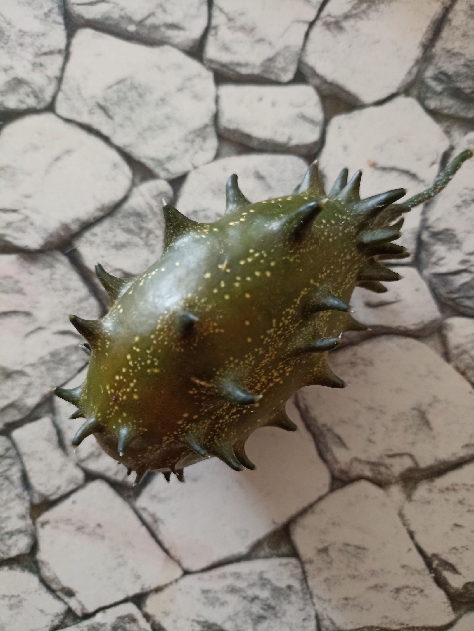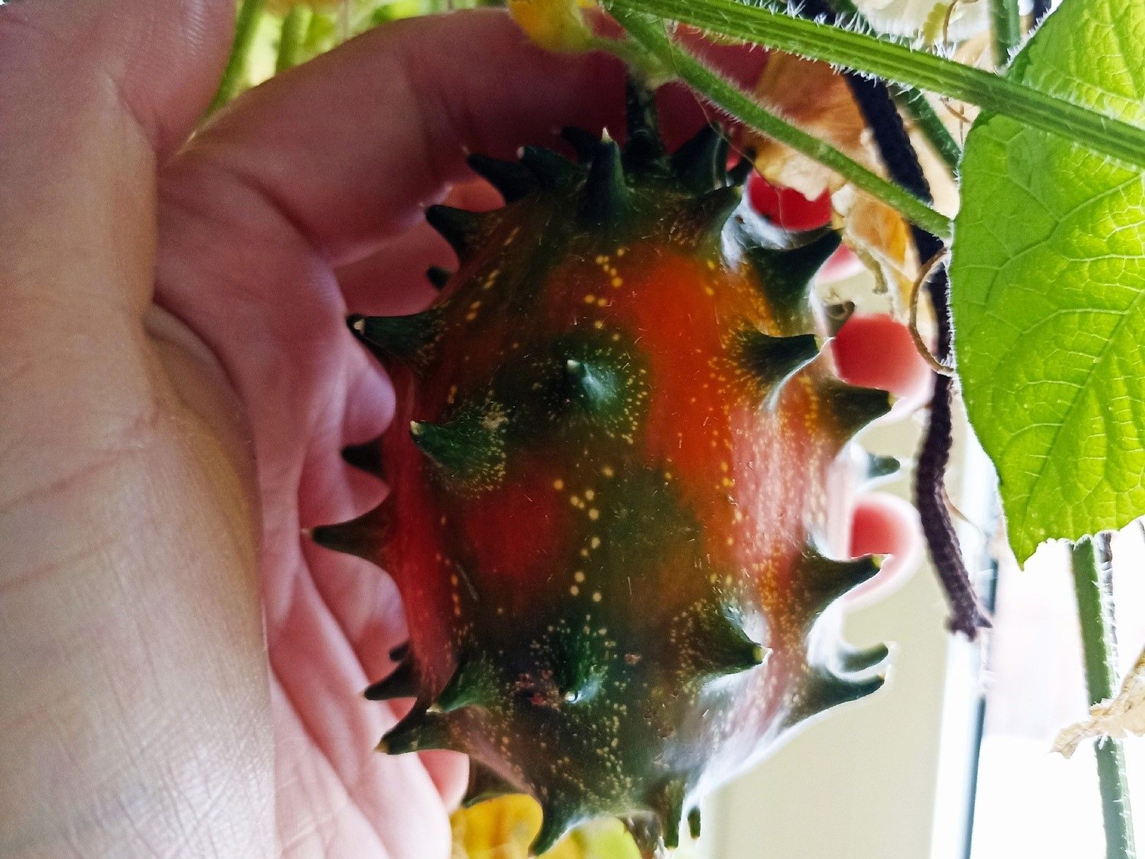 Плод, похожий на кактус, — на самом деле травянистая лиана семейства Тыквенные, вида Огурец. Вырастила его Ольга Жих. Называется он кивано.