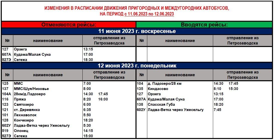 В предпраздничный день, 11 июня, рейсы по пригородным маршрутам будут выполняться по расписанию субботы. Не состоятся рейсы №127 на Орзегу в 13:15, №607-а «Кудама/Малая Суна» в 17:00 , №527-э в Сегежу в 18:30.