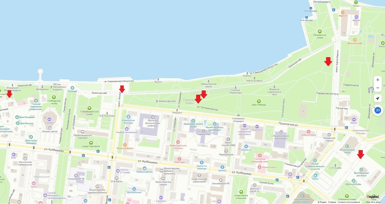 Туалеты подключены к электросетям, водоснабжению и канализации. Они расположатся в следующих точках (см. на схеме): на Онежской набережной (рядом с уличными тренажерами), в парке Победы (от тренажеров по велопешеходной дорожке вглубь парка), в парке Победы (в районе проспекта Карла Маркса напротив входа в парк аттракционов), на площади Кирова (тротуар возле выставочного зала «Кижи» напротив Музыкального театра).