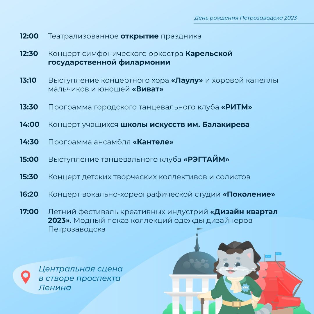На набережной Петрозаводска началась ярмарка. В створе проспекта Ленина установлена сцена, где состоятся главные события праздника. Салюта сегодня не будет, а вот выступление группы «Кар-Мэн» состоится.