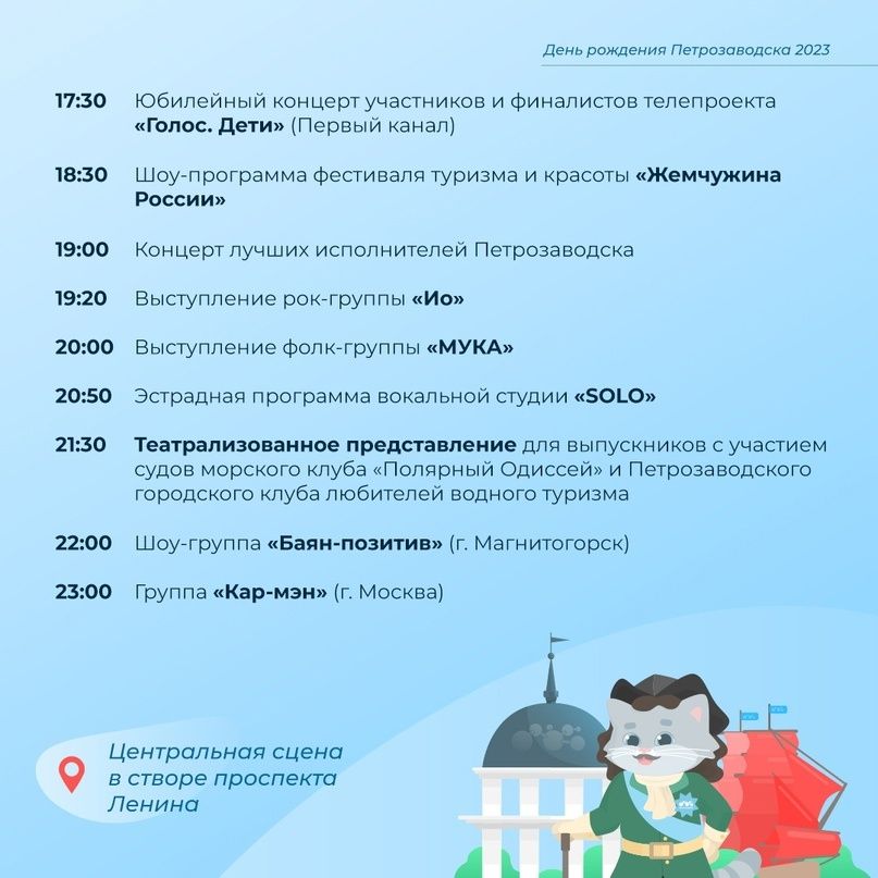 Тем не менее, концертная программа проходит по плану. Работают ярмарка, торговые и развлекательные ряды, «Иллюзии старого города» от музея «Кижи». Прибыла и бригантина с алыми парусами.