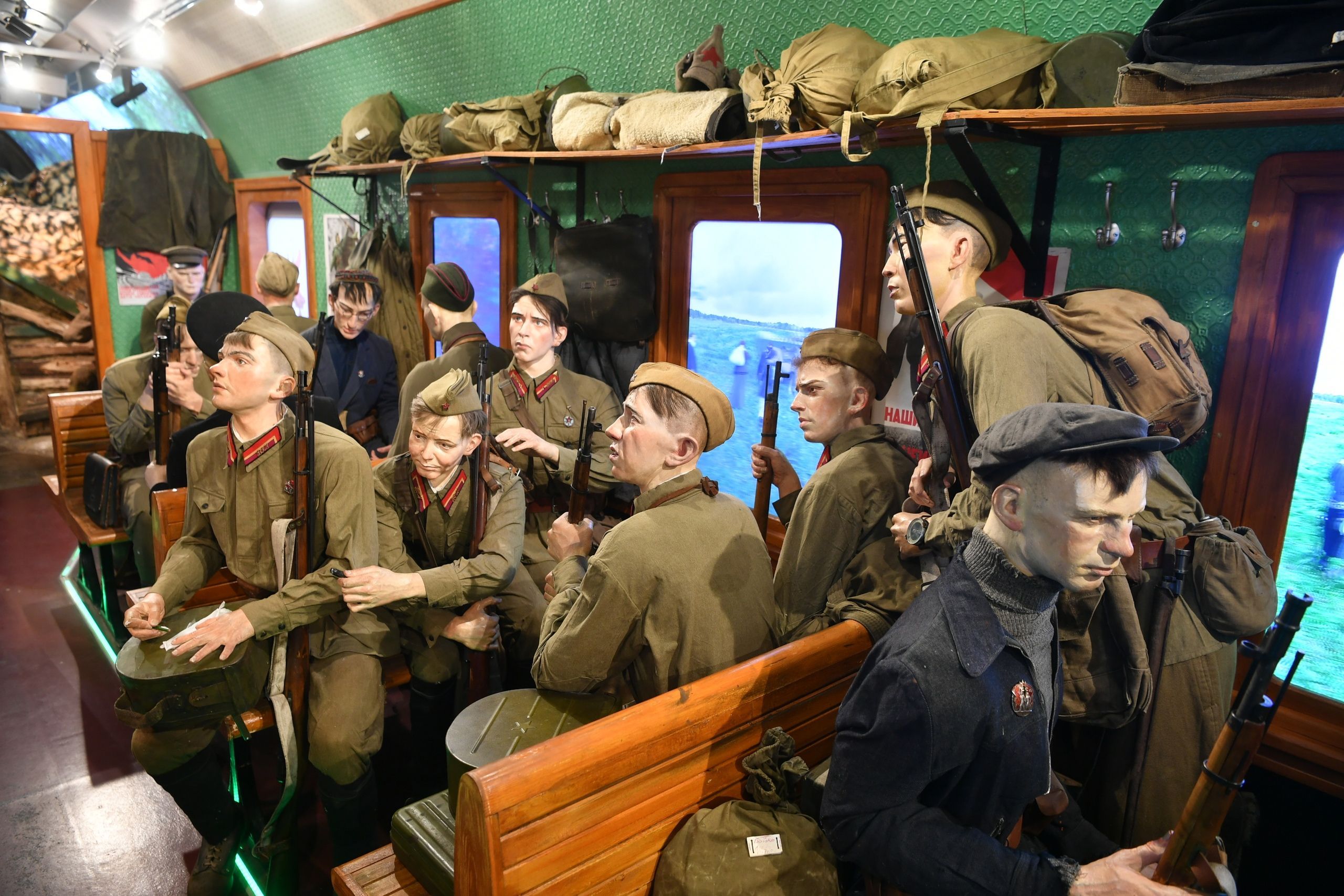 Передвижная выставка состоит из 10 экспозиционных вагонов, где есть зарисовки из довоенной жизни страны, фрагменты боев в разных условиях, санитарная часть, лагерь с военнопленными.