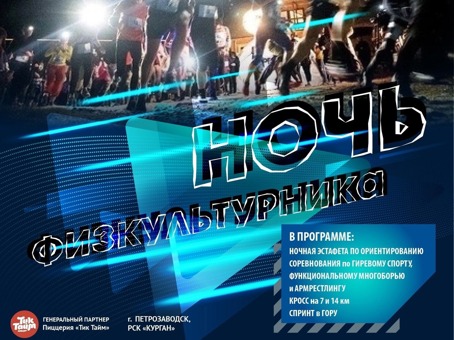 Организаторы подготовили насыщенную и разнообразную спортивную и развлекательную программу для всех желающих. В ней бег по пересечённой местности на 7 км и 14 км, а также ночная эстафета по спортивному ориентированию «Летяга». Гвоздем «Ночи физкультурника» станет спринт в гору на 200 метров на выбывание.