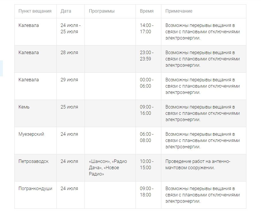 В Петрозаводске 24 июля с 10 до 15 часов из эфира уйдут радиостанции «Шансон», «Радио Дача» и «Новое радио». Из-за отключения электричества в Калевале несколько дней ожидаются кратковременные перебои в вещании.