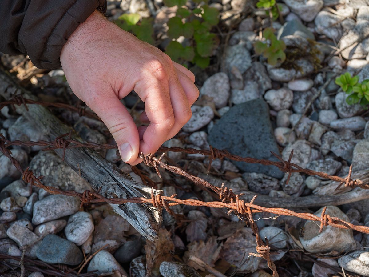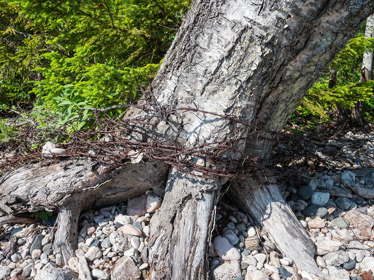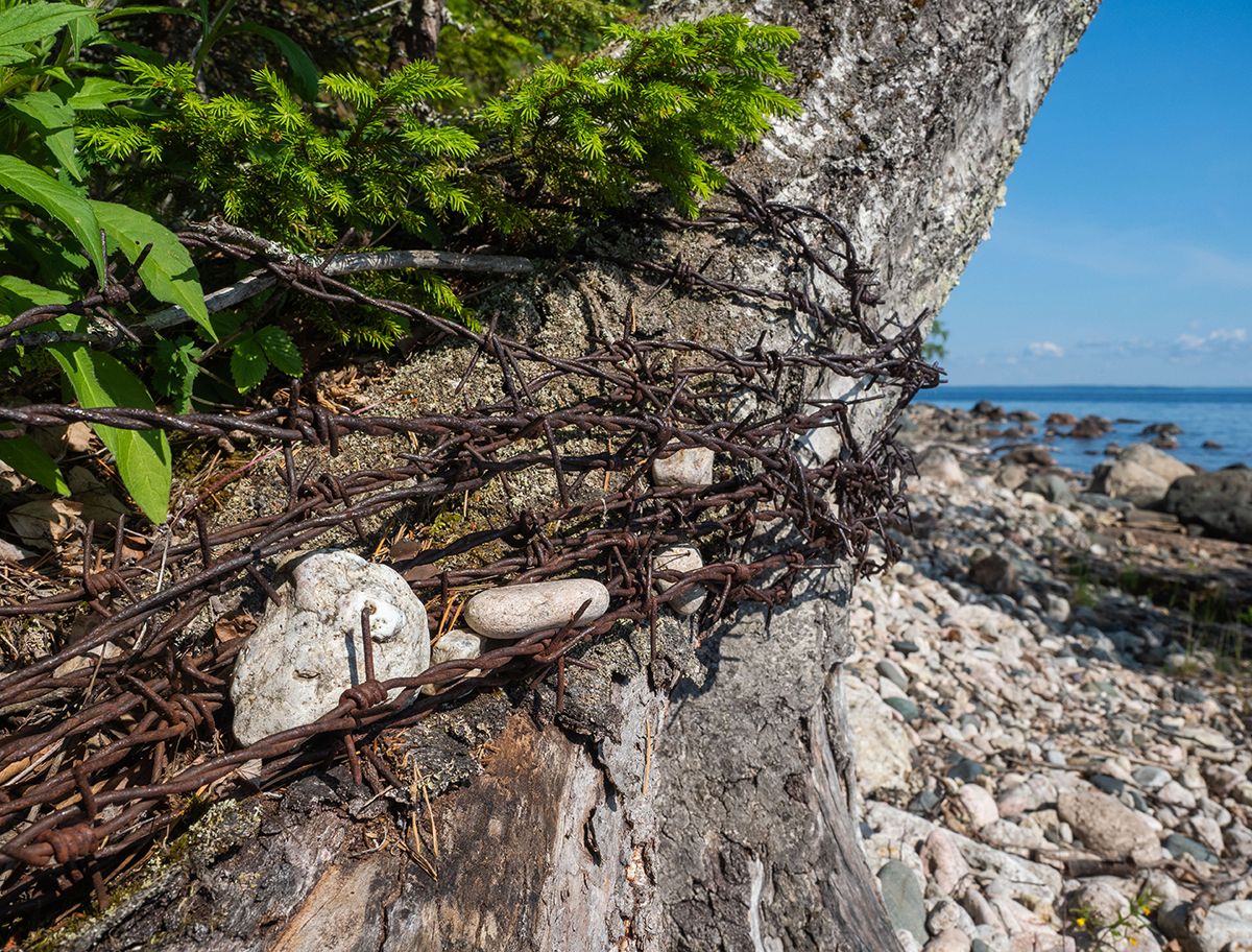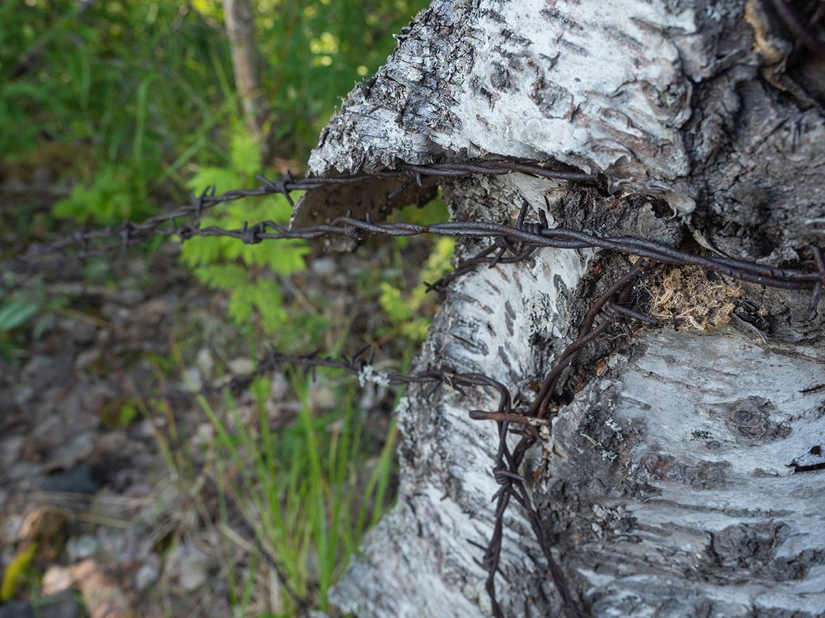 Надо сказать, что колючая проволока была уложена финскими военными основательно – просто так достать ее непросто. Она вросла в землю, и намертво обвила некоторые деревья. Береговая линия 80 лет назад действительно была недоступна человеку. Любой, кто попытался бы преодолеть эту колючку, гарантированно запутался бы, как в паутине.