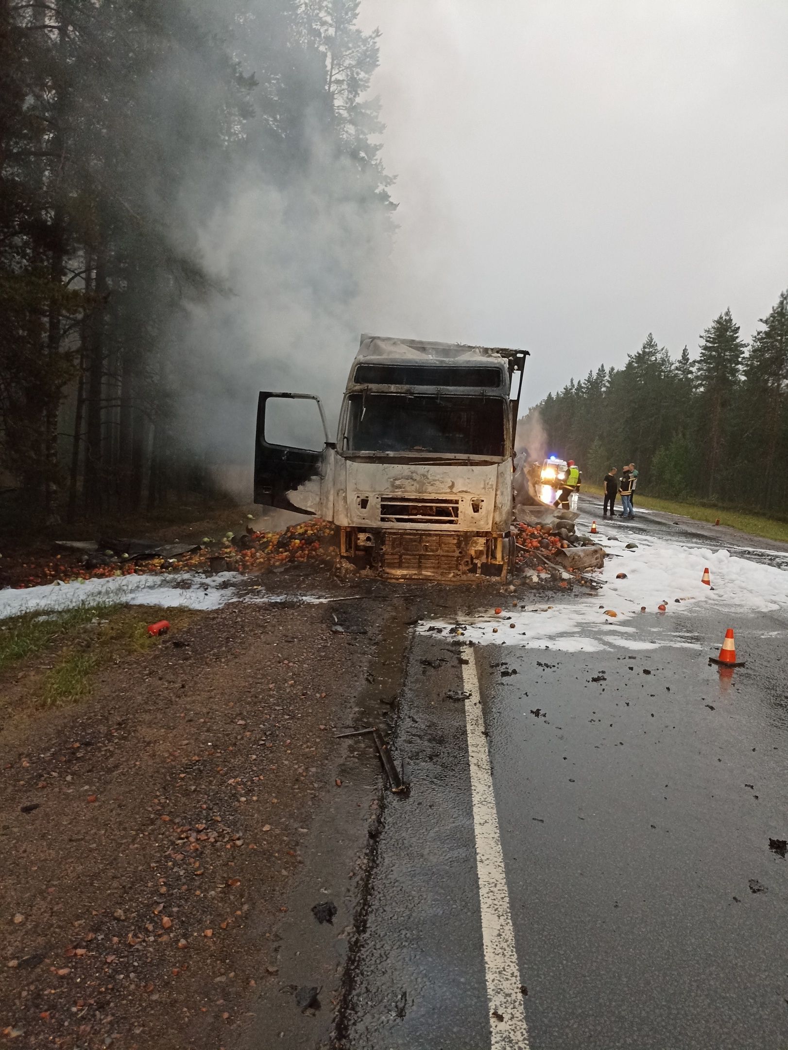 Грузовик загорелся 260 километре трассы «Кола». Для ликвидации возгорания привлекались пожарные из Олонца и Лодейного поля. Были задействованы 11 человек и три единицы техники.