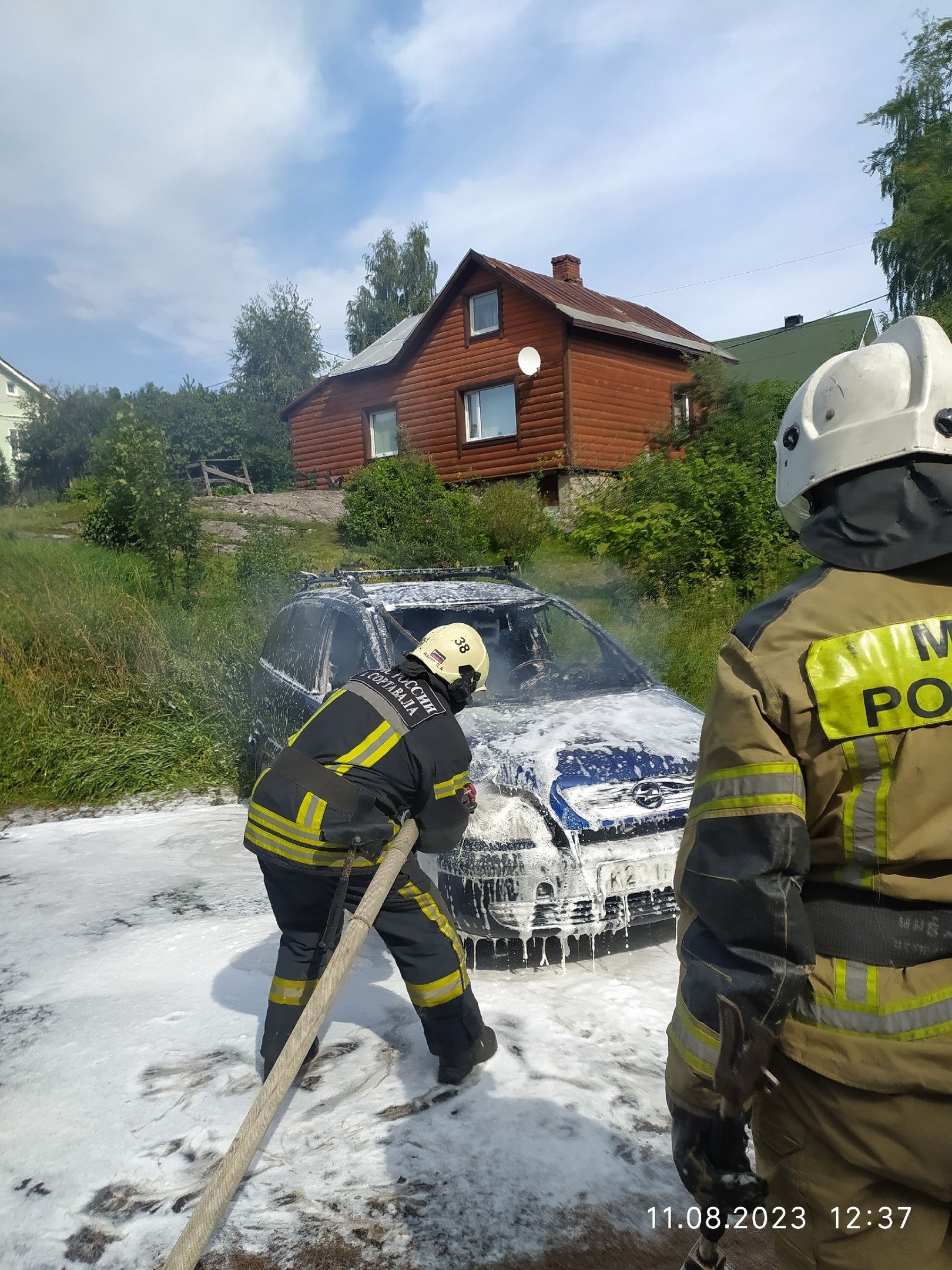 Дорога заняла у пожарных три минуты. Горел автомобиль «Опель». К тому моменту, как спасатели прибыли на место, салон автомобиля был полностью охвачен пламенем, в машине установлено газовое оборудование.