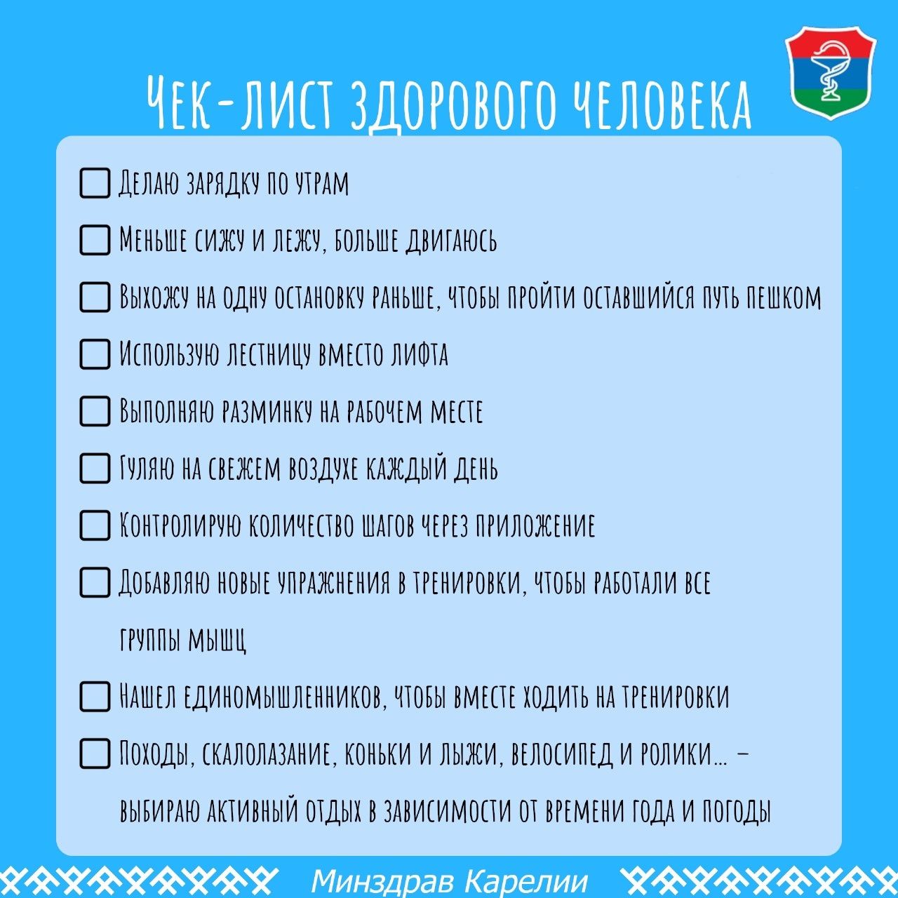 «Делаю зарядку по утрам; меньше лежу, а больше двигаюсь; использую лестницу вместо лифта; делаю разминку на работе; ежедневно гуляю на свежем воздухе». В чек-листе от министра здравоохранения 10 пунктов, и все они связаны так или иначе с физической активностью.
