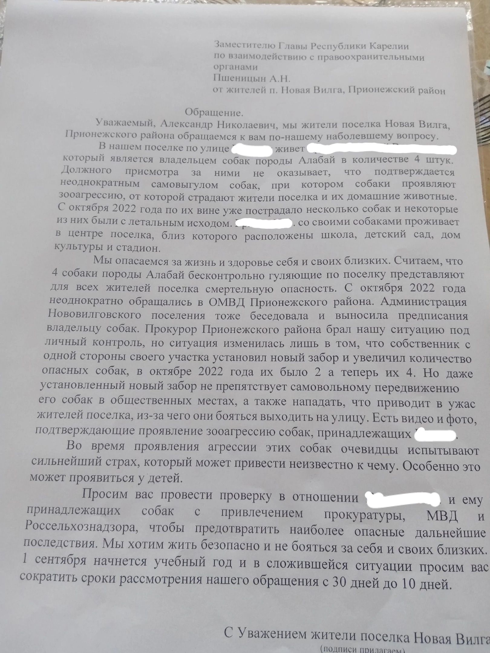 В нашем поселке живет человек, который является владельцем собак породы алабай в количестве 4 штук. Должного присмотра за ними нет, что подтверждается неоднократным самовыгулом собак. Они проявляют агрессию, от которой страдают жители поселка и их домашние животные. Есть соответствующие видео и фото, — пишут местные жители в паблике «Новая Вилга».