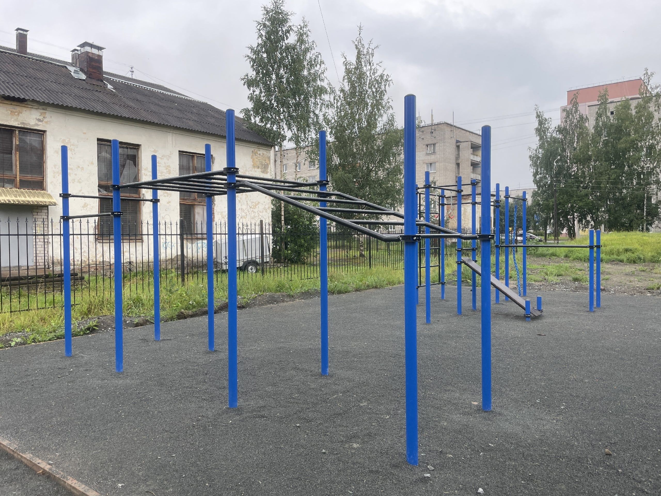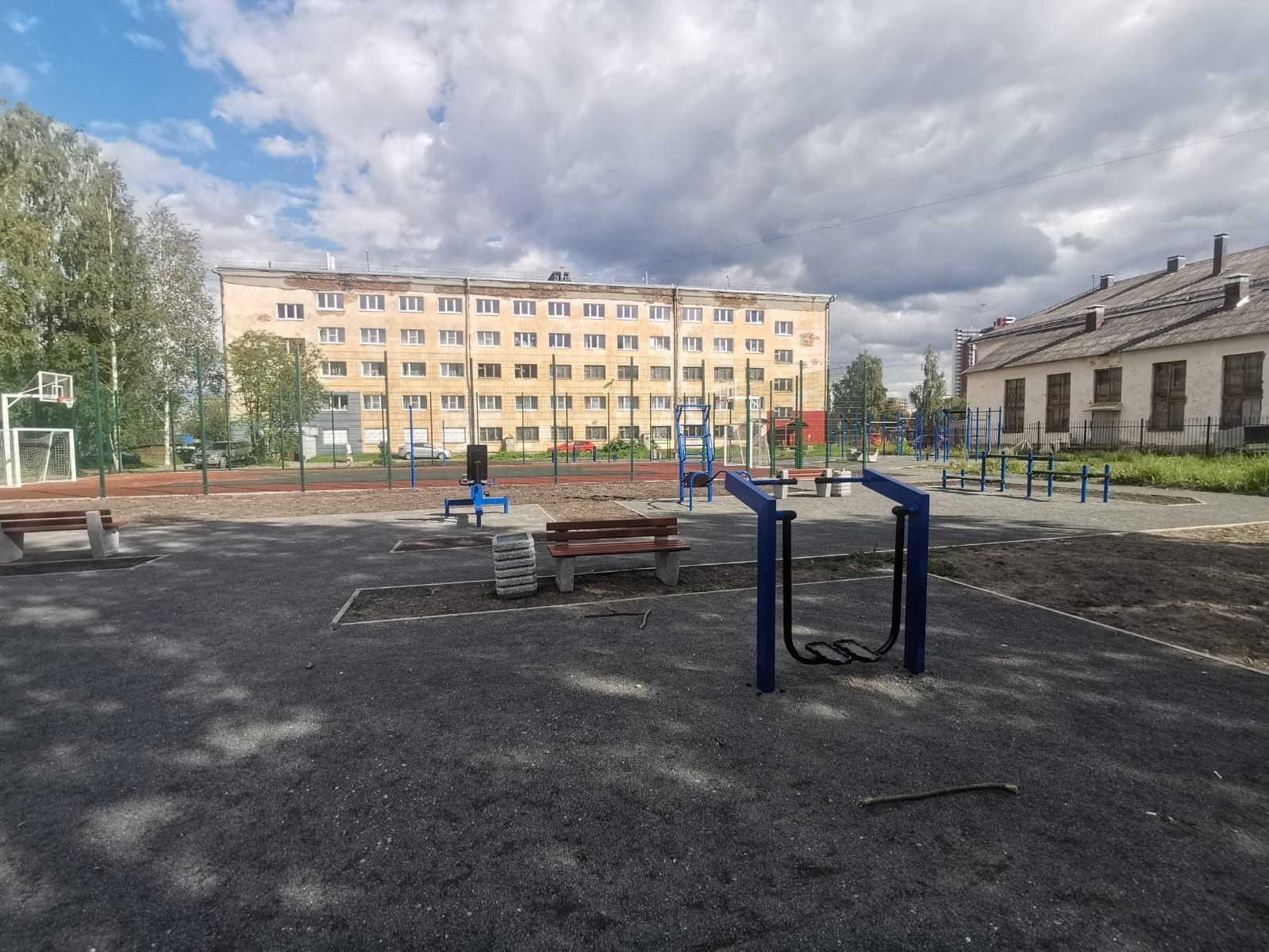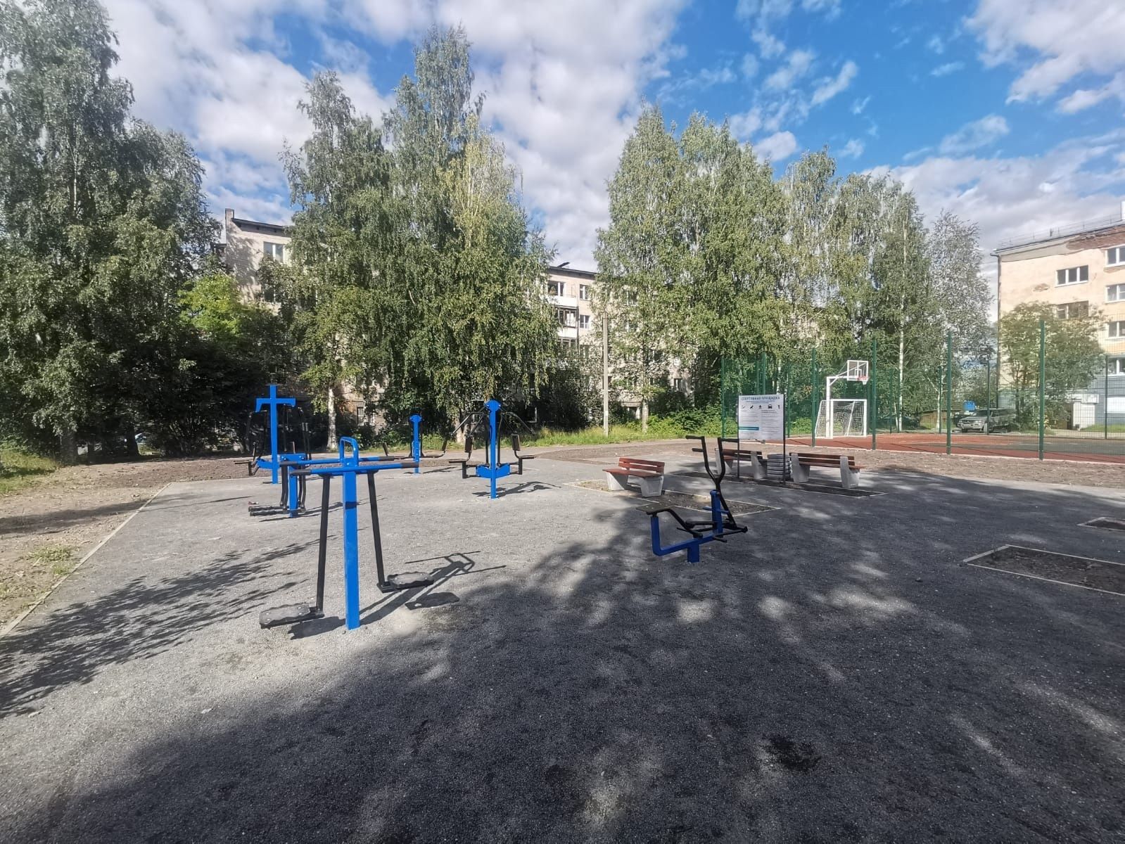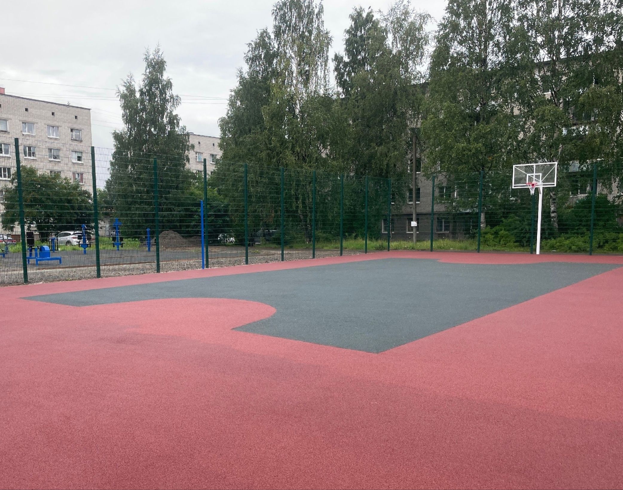 На спортивной площадке размером 30 на 15 метров сделали резиновое покрытие. Теперь здесь можно играть в футбол, волейбол и баскетбол.