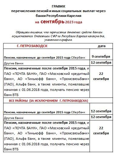 Соцфонд Карелии опубликовал график перечисления пенсий и социальных выплат в сентябре.