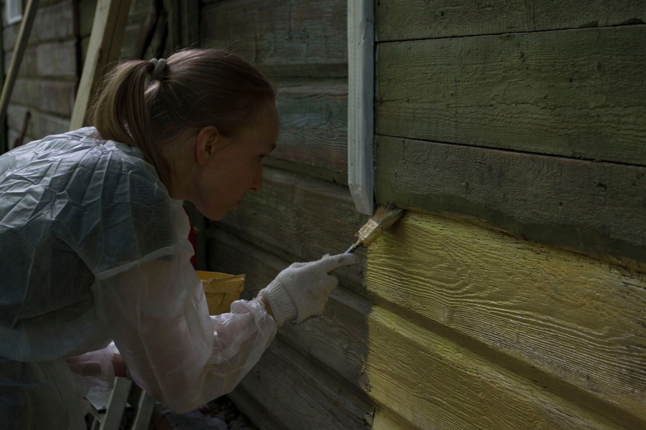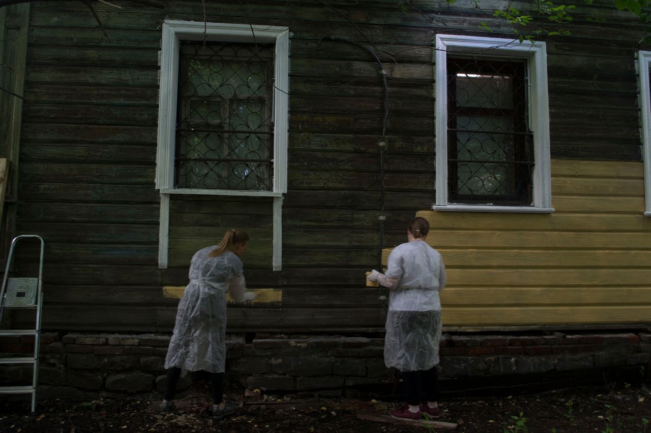 Участники «Том Сойер Фест-Петрозаводск» демонтировали старые обгоревшие доски обшивки, зашили участок стены из сохранившихся досок, в верхней части для обшивки стен применили новые доски, очистили от старой краски стены и оконные наличники. Покрасили дом. Закрыли дыру, оставшуюся после пожара двадцатилетней давности, защитили фундамент рубероидом.