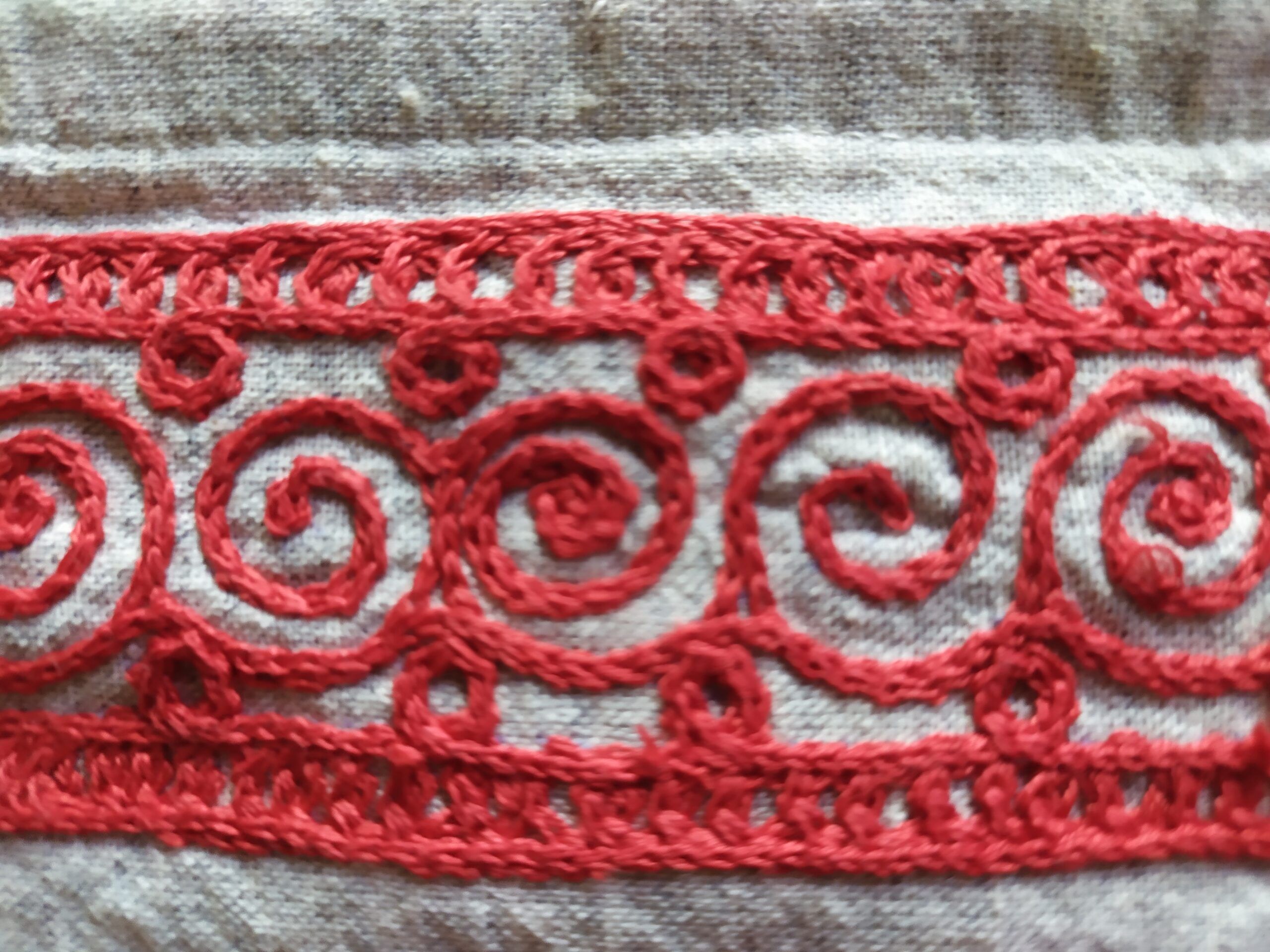 Есть ряд характерных особенностей, поясняет Екатерина. Обычно говорят, что главная особенность заонежской вышивки — это красно-белый цвет. Но есть и другие характерные черты. Например, плавность растительного орнамента, рисунок цветочных мотивов, «дырочки в раскол» на лепестках, или очень характерное завершение полотенец таким зубчатым краем, который похож на лемех деревянной архитектуры. Возможно, в Заонежье был фирменный почерк, поэтому интересно, что в текстильных и деревянных памятниках это так перекликается.