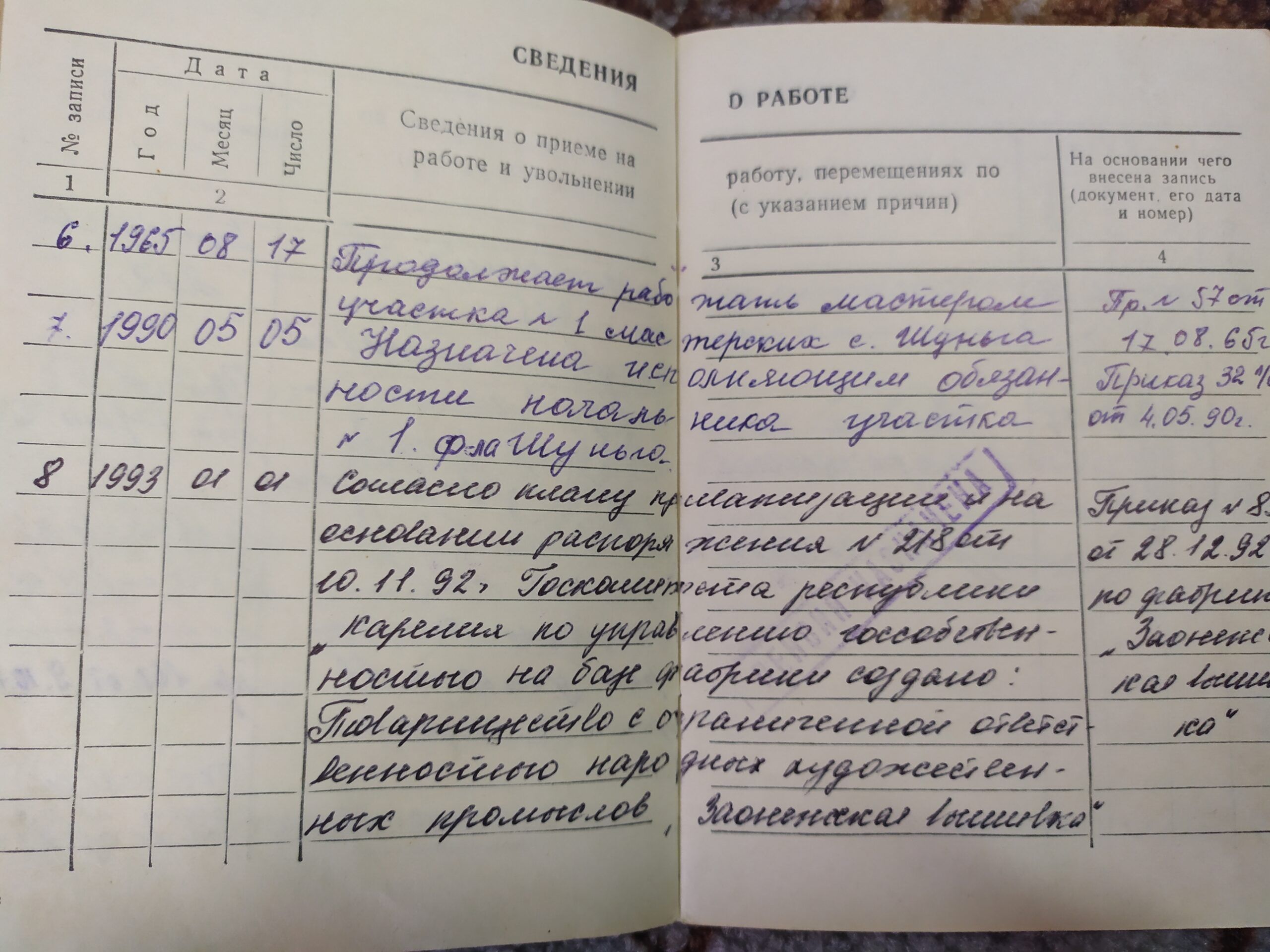Истории появления работниц на фабрике разные. Инна Николаевна Карпина приехала из Торжка. И понятия не имела, что за Карелия такая, что за Шуньга – направили и поехала после окончания художественного училища при Золотошвейной фабрике. Говорит, вышивку любила со школьной скамьи. Так всю жизнь и проработала на фабрике – в трудовой книжке сделана единственная запись. Чем занималась, помнит в деталях.