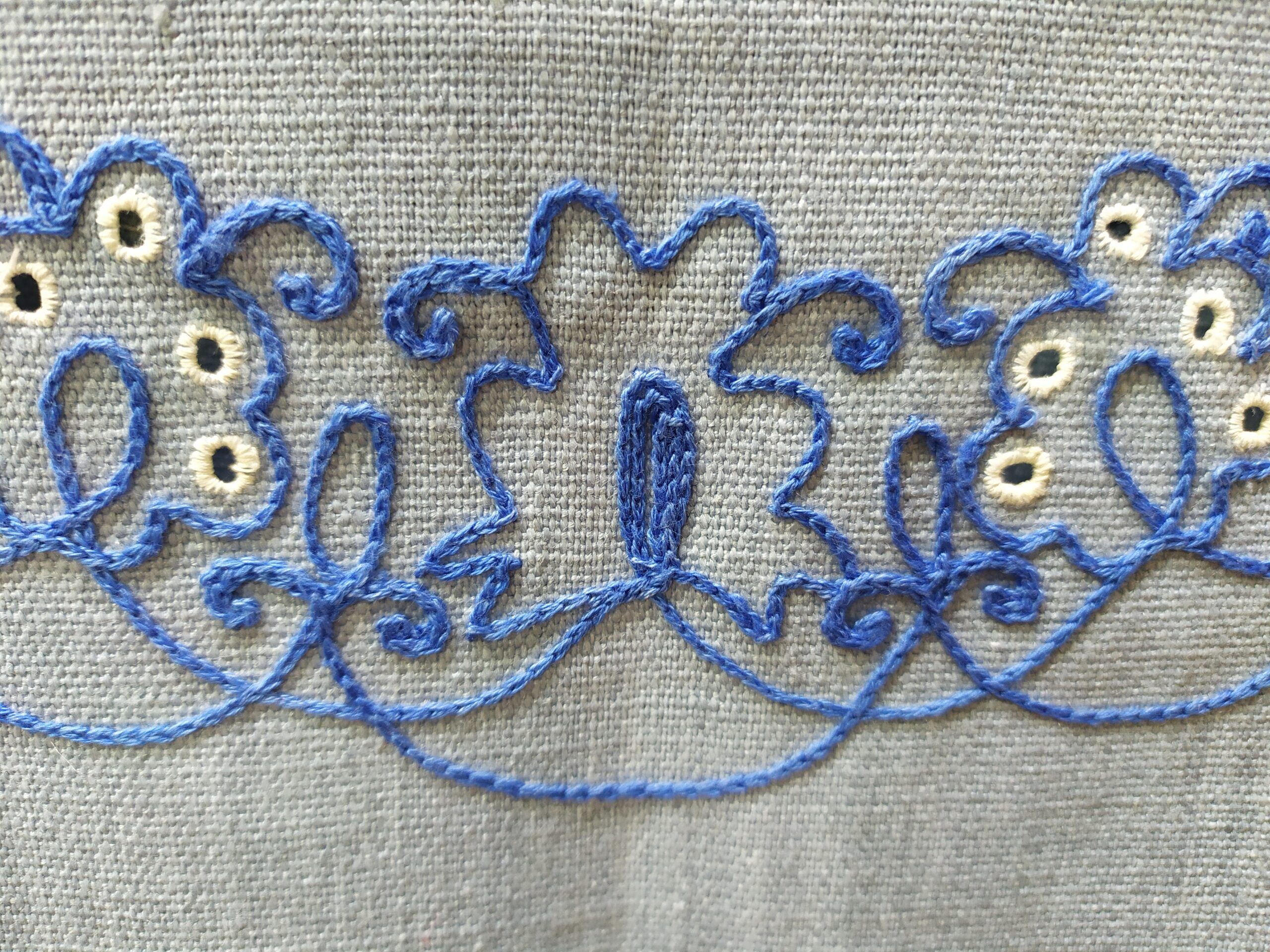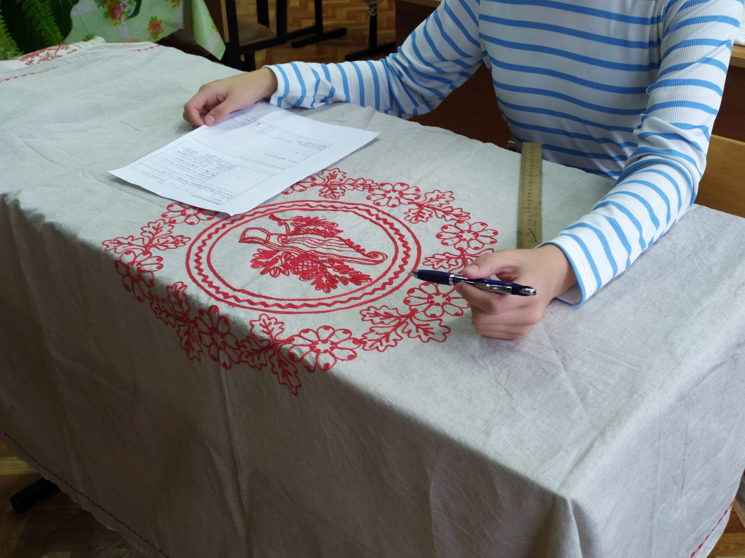 Сначала накалывала рисунки. Трафарет был на бумаге. Сверху клала кальку, закрепляла ее, чтобы не сползла и карандашом с иголкой колола, как стежки маленькие с промежутком по 1-2 миллиметра по всему периметру. Потом синькой наводила рисунок на ткань с кальки этой. А потом девчата вышивали по этому рисунку. Синька с керосином была. Пахло, конечно, — говорит Инна Николаевна.
