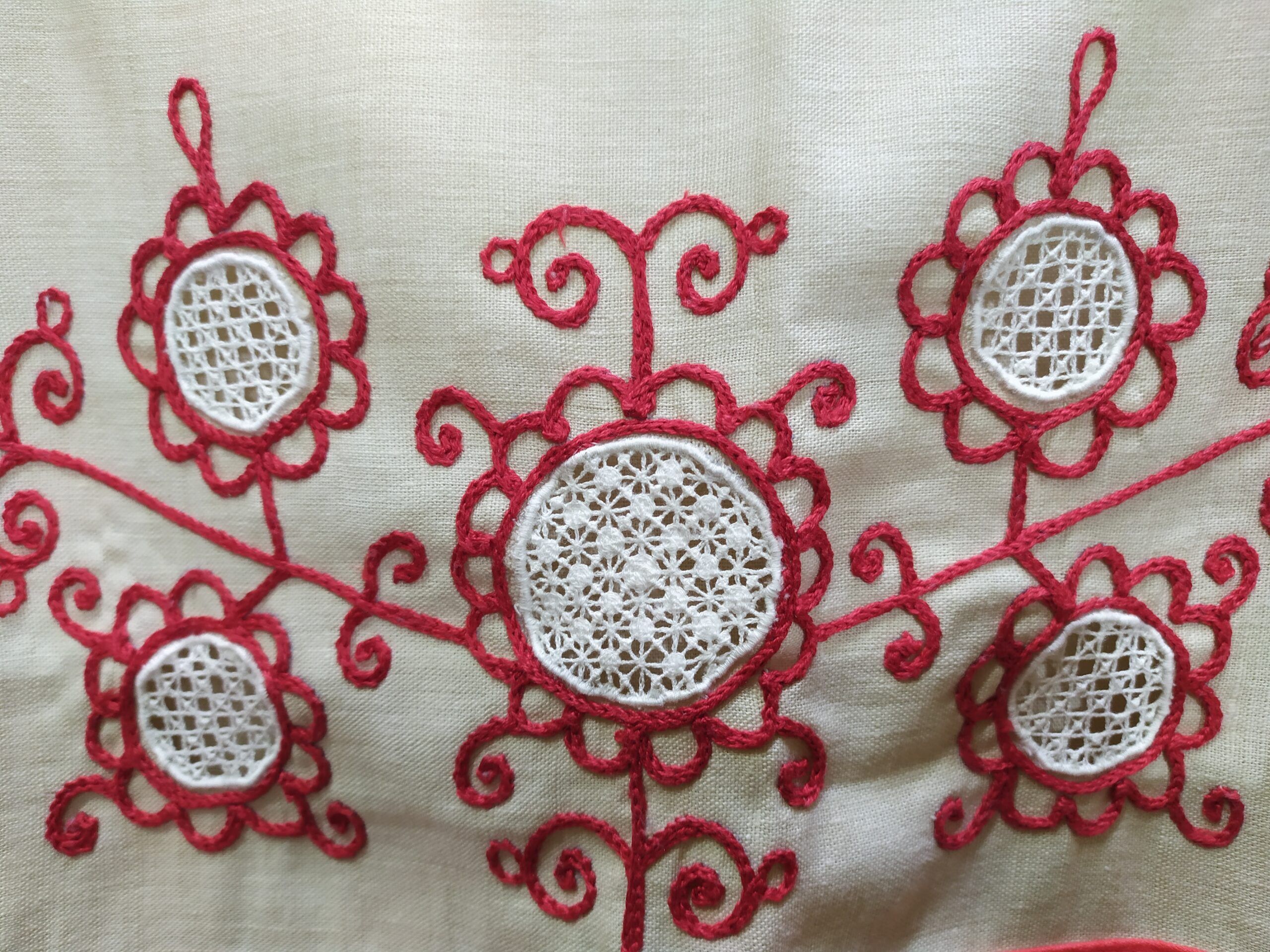 Есть ряд характерных особенностей, поясняет Екатерина. Обычно говорят, что главная особенность заонежской вышивки — это красно-белый цвет. Но есть и другие характерные черты. Например, плавность растительного орнамента, рисунок цветочных мотивов, «дырочки в раскол» на лепестках, или очень характерное завершение полотенец таким зубчатым краем, который похож на лемех деревянной архитектуры. Возможно, в Заонежье был фирменный почерк, поэтому интересно, что в текстильных и деревянных памятниках это так перекликается.