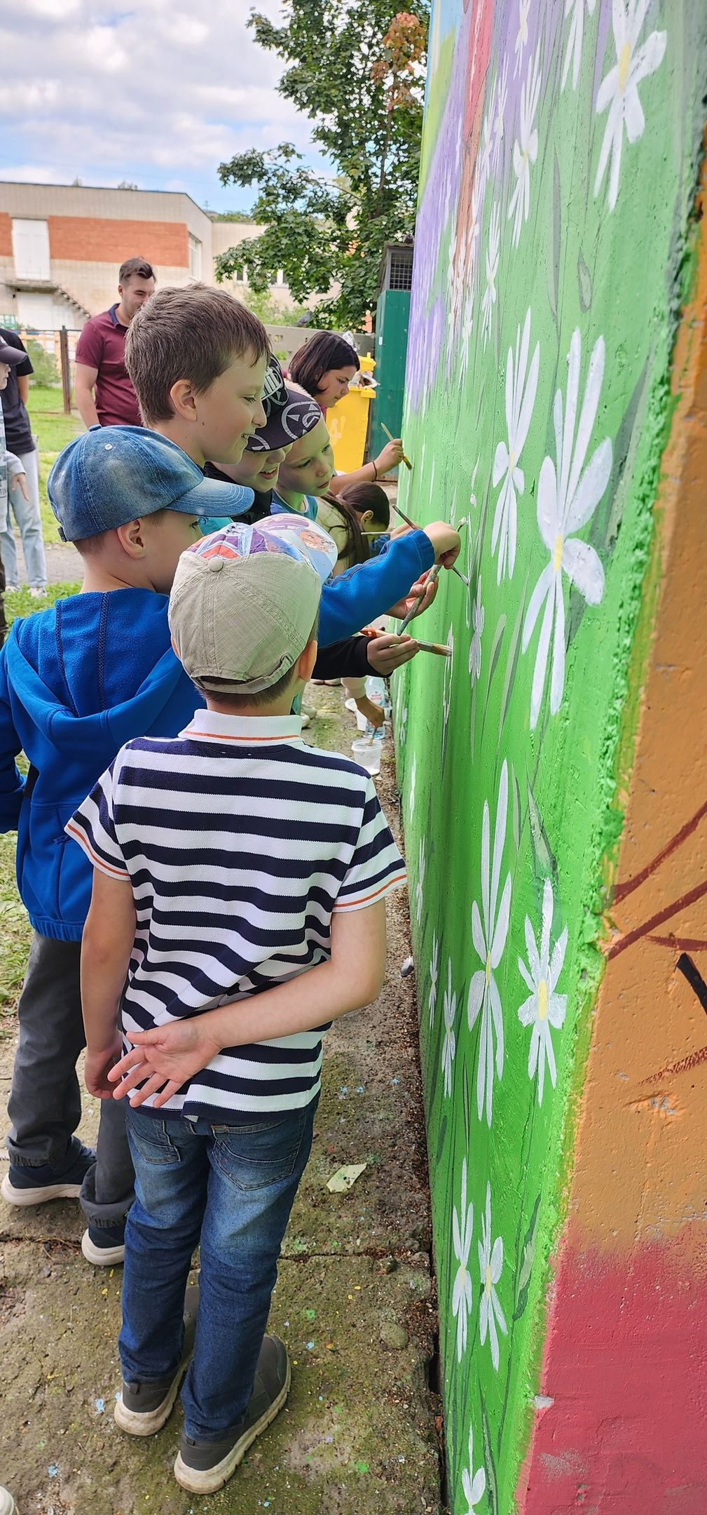 Ребятам было предложено помочь автору изображений дорисовать одну из стен. Тем самым граффити превратилось в веселый флешмоб, где каждый из детей мог попробовать себя в роли уличного художника.