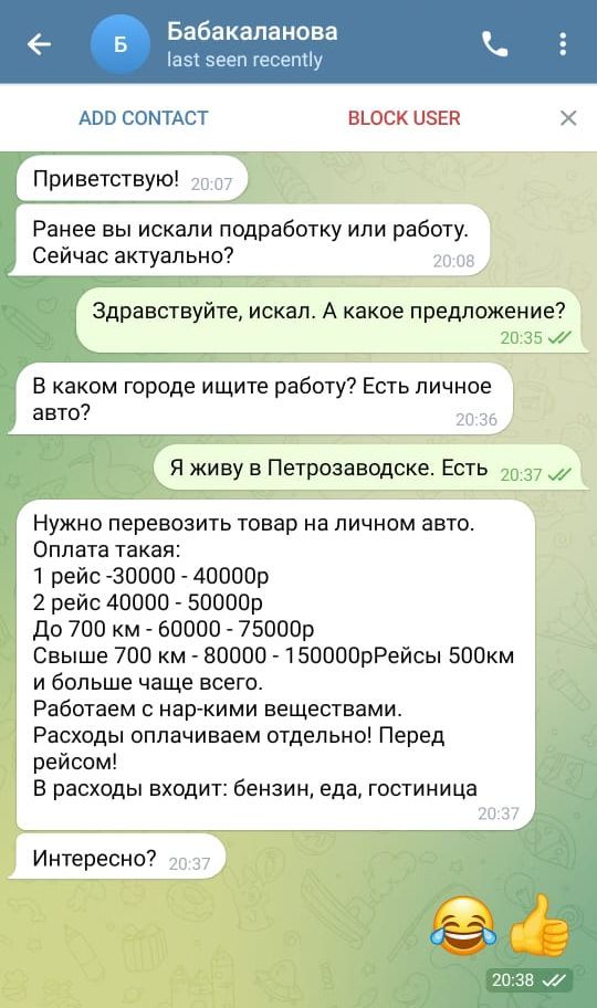 В распоряжении портала «Карелия.Ньюс» оказалось реальное предложение о работе наркокурьером, которое получил наш читатель, житель Петрозаводска. Сообщение он получил по мессенджеру Телеграм. Ранее он искал работу, размещал резюме. Новоявленный «работодатель» написал сам. Вот скриншот этого предложения.