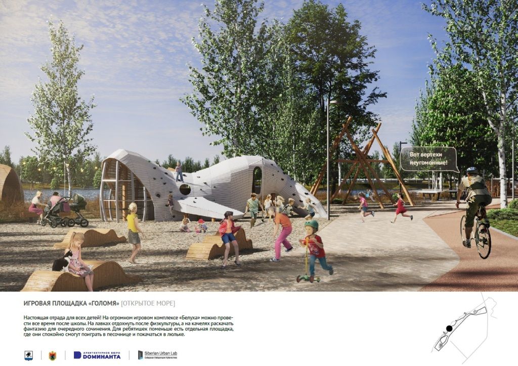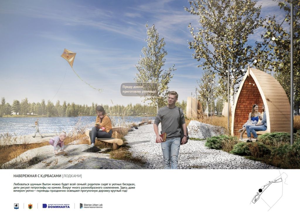 Плавные формы скамеек и шезлонгов ассоциируются с морскими волнами, сети в малых архитектурных формах и игровых конструкциях напоминают о традиционном для севера Карелии рыбном промысле, небольшие беседки вырастут на берегу носами лодок – карбасами, а фасад теплышки со сценой и визит-центром выполнят в геометрии рыбьей чешуи. Важным одним элементом благоустройства в морской стилистике станет декоративный маяк – деревянная конструкция будет использоваться в качестве смотровой площадки для жителей и гостей города. Не обойдется и без одного из главных символов Беломорска – петроглифов. Стилизованную резьбу нанесут на камни набережной, чтобы дети могли создавать рисунки, используя рельефные изображения.