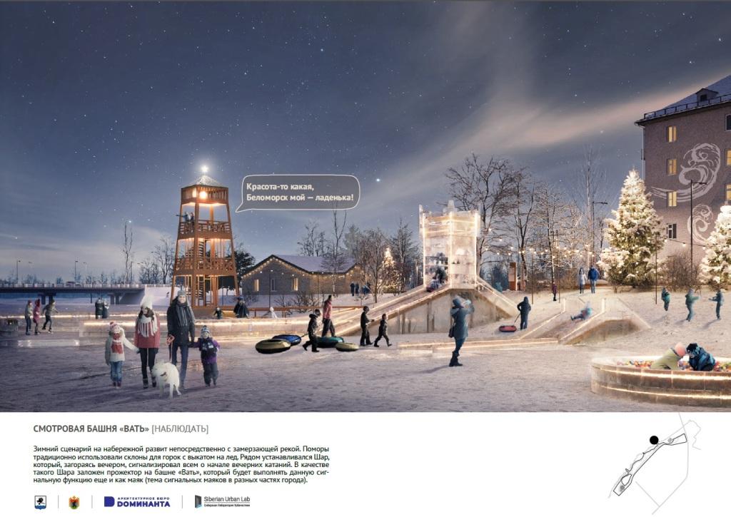 Новое общественное пространство раскинется на территории в 1,3 гектара. Оформление набережной предполагает содержание этнокультурного компонента. Поморская культура будет использована в том числе в элементах дизайна. В центре концепции – «Прошлое» – Беломорские петроглифы, «Вечное» – поморский этнос, сохранение его самобытности и истории и «Бесконечное» – Белое море и промысловая идентичность поселения.