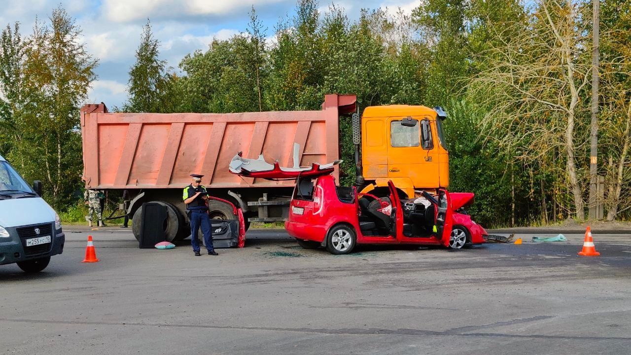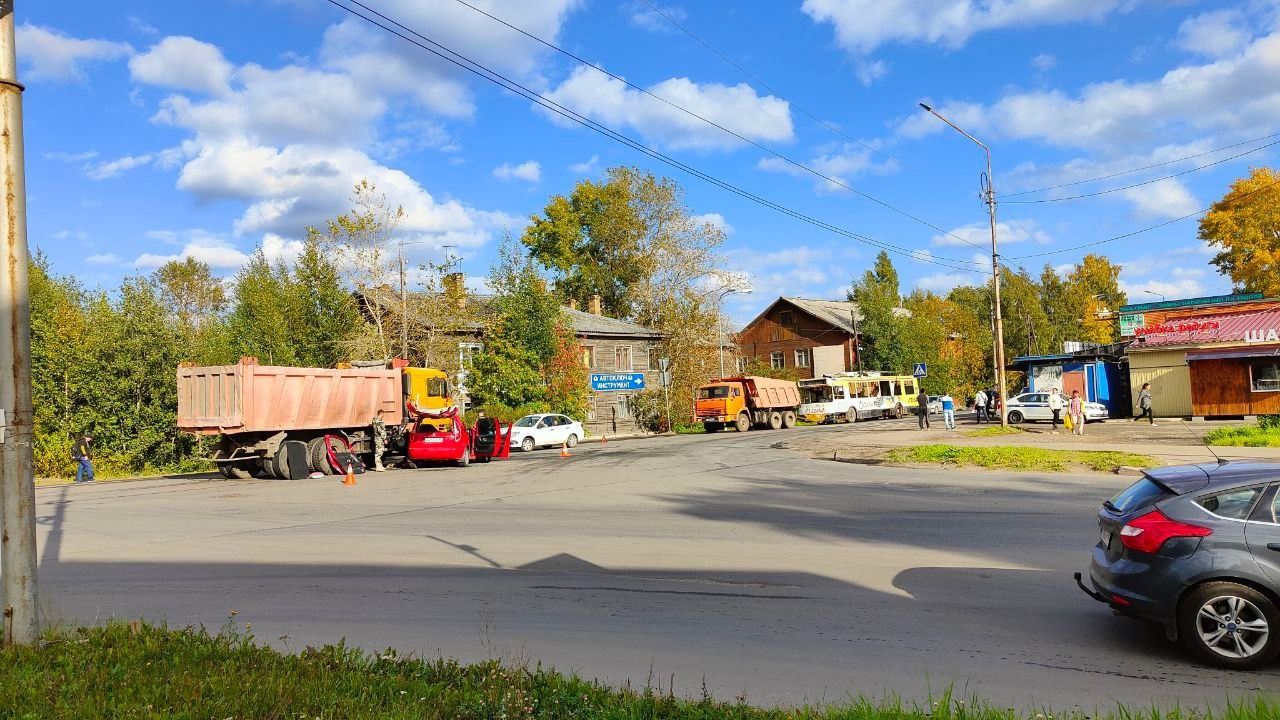 Видно, что самосвал двигался в прямом направлении в сторону улицы Боровая. В это же время легковой автомобиль выезжал с улицы Халтурина, совершая левый поворот на улицу Пограничная (главная дорога). В результате столкновения легковой автомобиль отбросило вправо. Самосвал проехал еще несколько метров, после чего оба участника ДТП столкнулись с третьим автомобилем, выезжающим на перекрёсток с улицы Боровая. Напомним, на место аварии привлекались сотрудники МЧС, они вытаскивали пострадавших из машины.