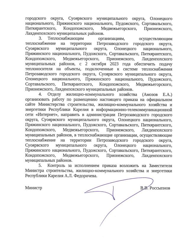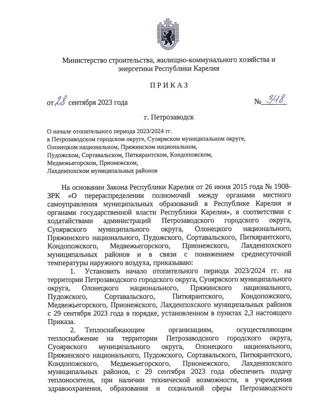 Отопительный сезон в Петрозаводске начнется в пятницу, 29 сентября. Соответствующий приказ подписал сегодня глава Минстроя Карелии Виктор Россыпнов.