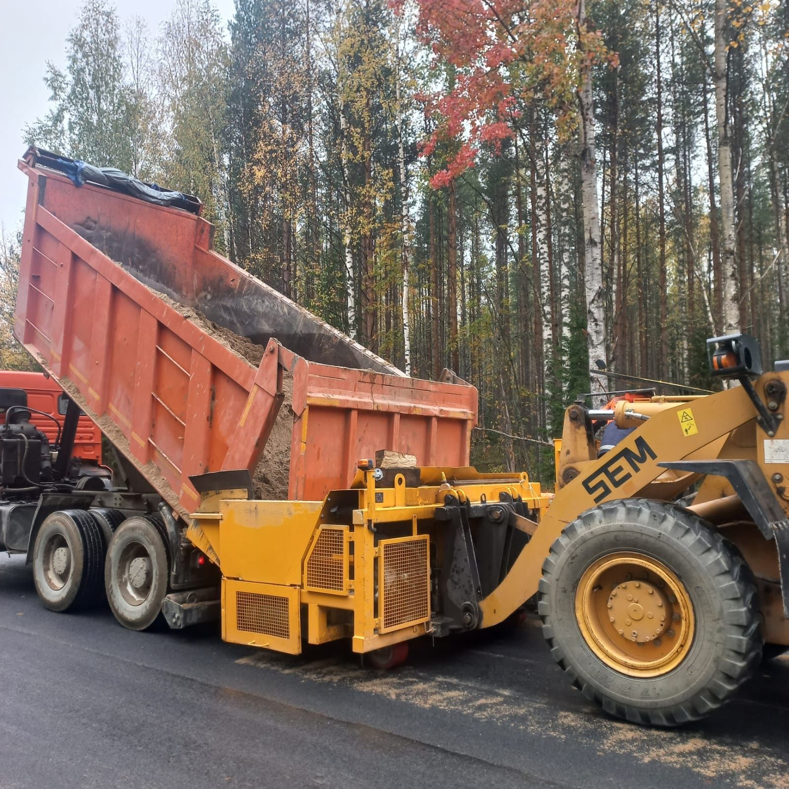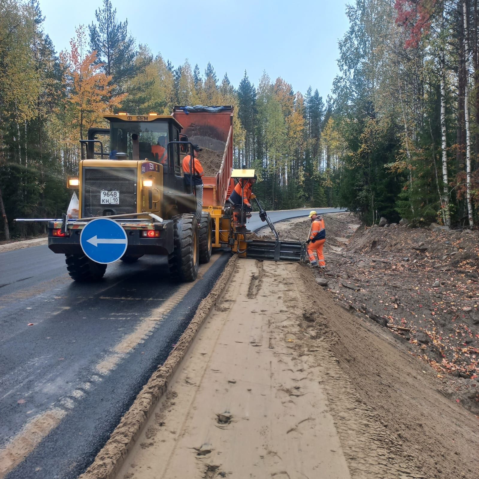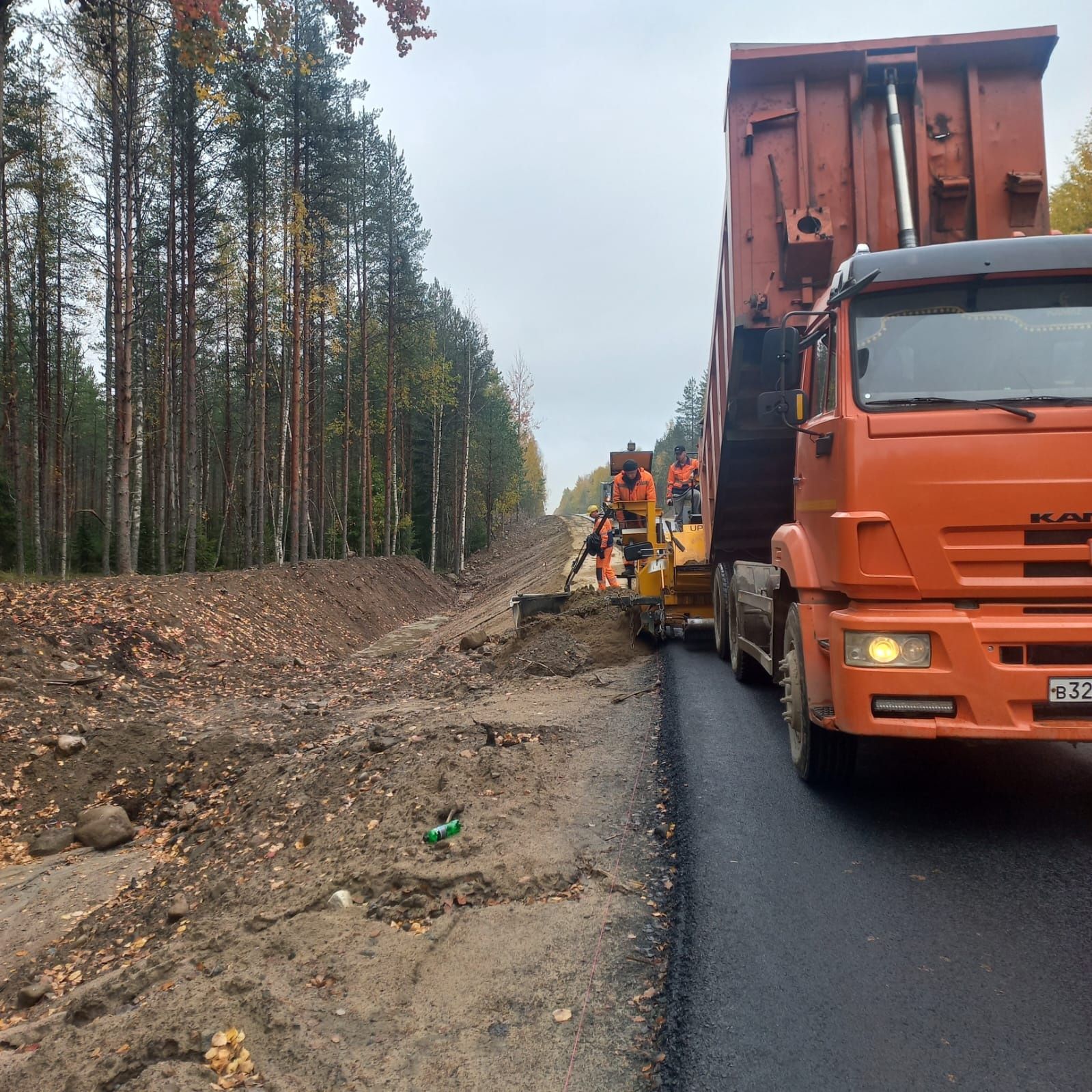 Специалисты Кондопожского дорожно-строительного управления ведут работы по выемке грунта, устройству подстилающих слоев, устройству ЩПС, одновременно идет укладка асфальтобетонного покрытия, уложено порядка 3 км, устройство площадок под 4 автобусные остановки, в заключение будут установлены дорожные знаки.