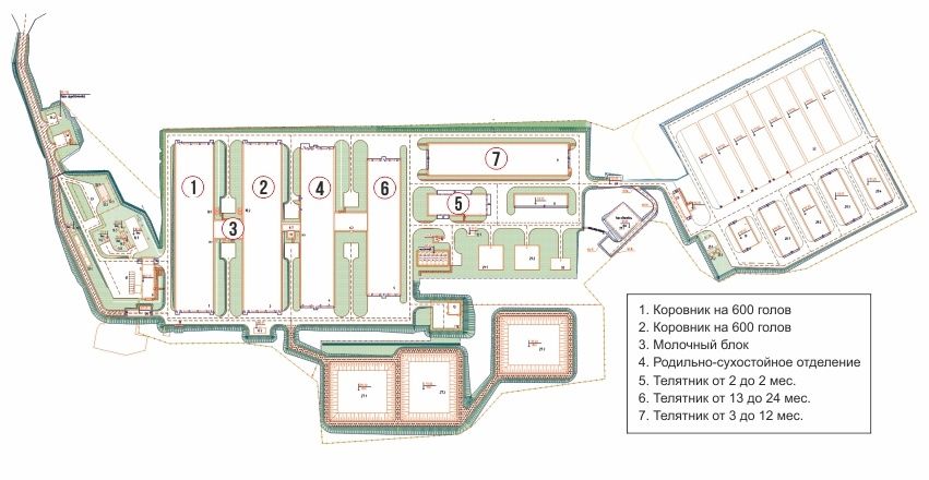 Площадь территории обширная, больше 180 тысяч кв. м., из них площадь застройки — около 70 тысяч кв. м. Планируется построить почти четыре десятка зданий различного назначения: два коровника на 600 голов каждый, молочный блок, родильно-сухостойное отделение, три телятника, рассчитанных на разный возраст животных, галерею с ветеринарным блоком, склад кормов, сараи для хранения сена, навозохранилище и т.д.