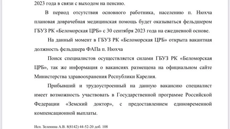 В Минздраве ответили на обращение женщины. В Нючху на месяц отправили фельдшера из Беломорской ЦРБ, однако постоянный сотрудник пока не найден. Что касается квартирного вопроса, в министерстве отметили, что медику окажут помощь по программе «Земский доктор».