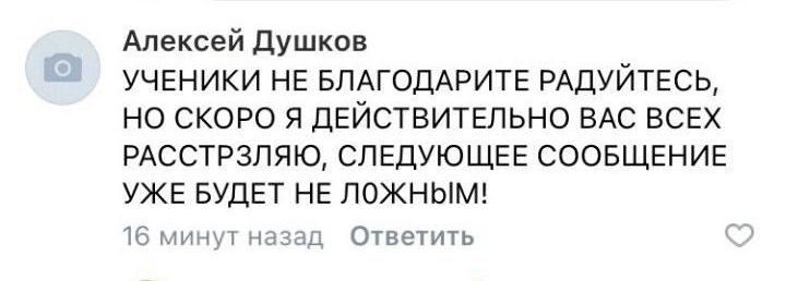 — Ученики не благодарите, радуйтесь. Но скоро я действительно вас всех расстреляю, следующее сообщение уже будет не ложным», — написал неизвестный.