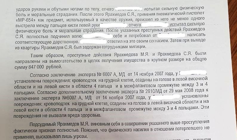 За сухими фразами из дела «организовав преступное сообщество и применяя физическое насилие» кроется банальное в стиле 90-х «прессование» Ярахмедовыми владельца жилья. Братья решили отомстить ни в чем не виновному О.Г., и отжать у него квартиру. В ход пошли угрозы убийством с ножом-бабочкой у горла, а также реальное избиение (кадашевские методы). В общем, Ярахмедовы вымогали у О.Г. сначала всю квартиру (что было невозможно, так как он владел только долей), а потом долю квартиры (стоимость которой на тот момент превышала 840 тысяч рублей). Ярахмедовы долгое время преследовали мужчину, водили его силой к нотариусу, запирали его на ключ в квартире на несколько дней, били его (удары наносил Сейдахмед). И даже больше: требовали от своей жертвы искать лиц, которые злоупотребляют спиртным, чтобы братья завладели и их квартирами.